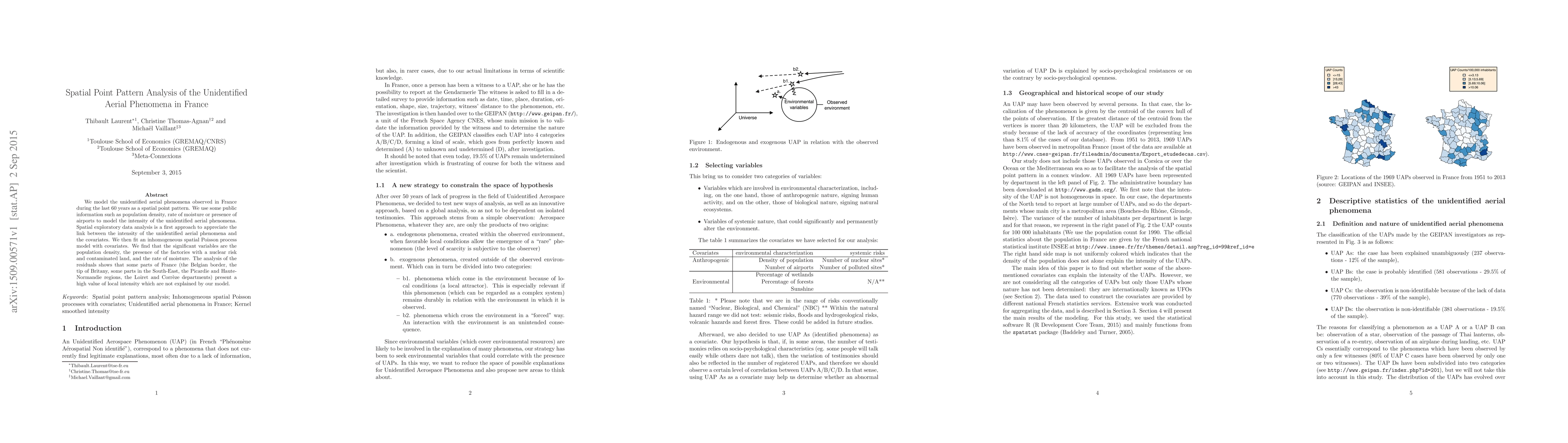 This study models unidentified aerial phenomena in France as a spatial point pattern, finding significant associations with population density, nuclear risk factories, contaminated land, and moisture rate. However, certain regions show unexplained high local intensity, indicating additional factors not captured by the model.