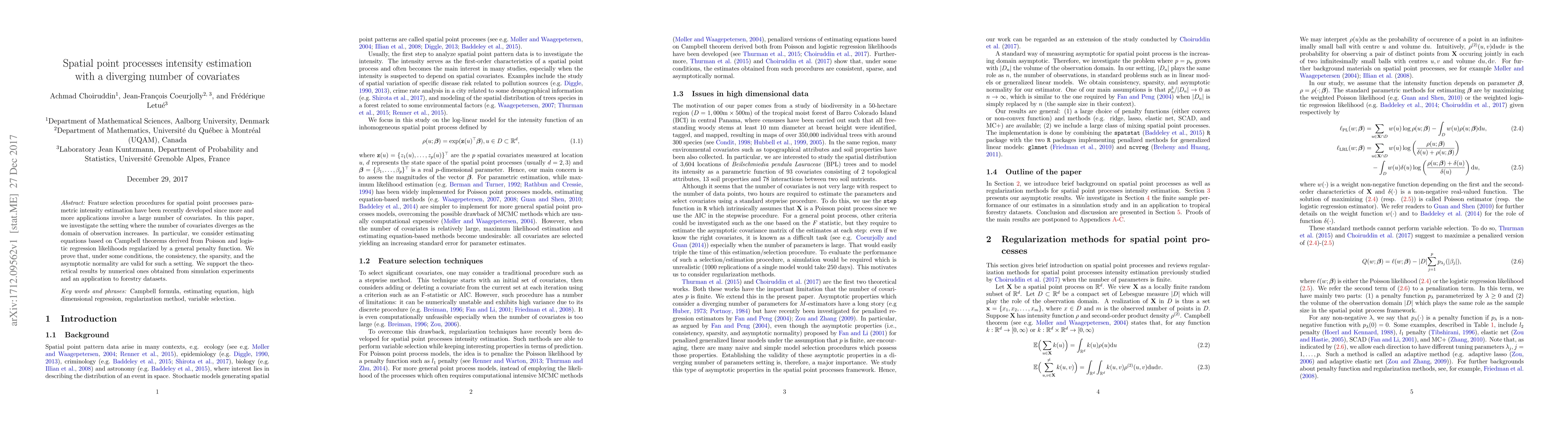 This paper develops feature selection methods for estimating the intensity of spatial point processes when the number of covariates grows with the observation domain. It proves consistency, sparsity, and asymptotic normality for estimation equations based on Campbell theorems and regularized likelihoods, with supporting numerical results from simulations and forestry data.