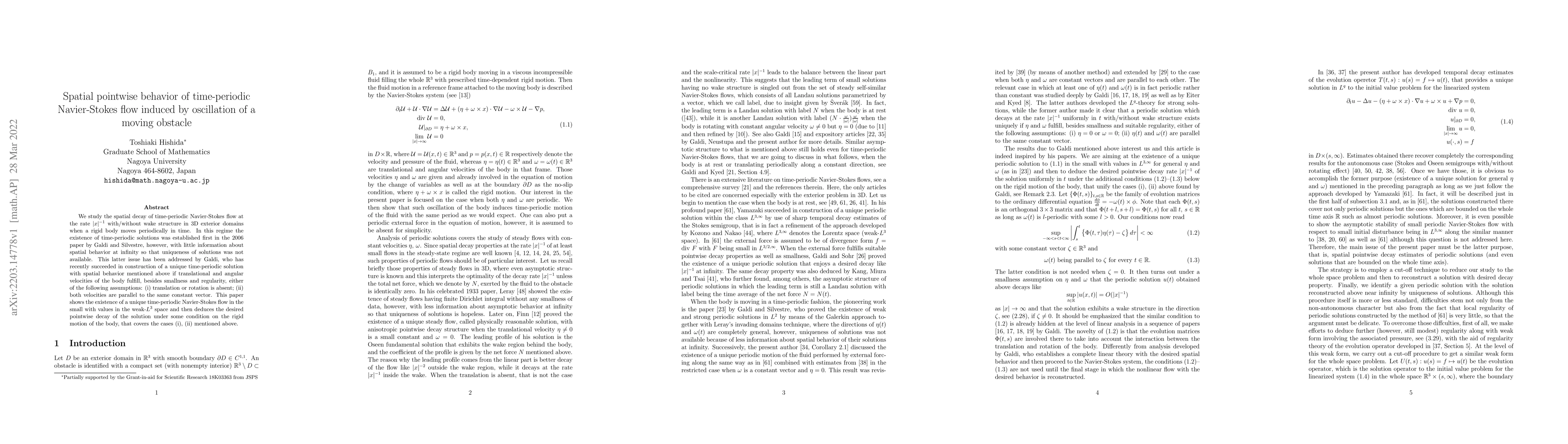 We study the spatial decay of time-periodic Navier-Stokes flow at the rate $|x|^{-1}$ with/without wake structure in 3D exterior domains when a rigid body moves periodically in time. In this regime the existence of time-periodic solutions was established first in the 2006 paper by Galdi and Silvestre, however, with little information about spatial behavior at infinity so that uniqueness of solutions was not available. This latter issue has been addressed by Galdi, who has recently succeeded in construction of a unique time-periodic solution with spatial behavior mentioned above if translational and angular velocities of the body fulfill, besides smallness and regularity, either of the following assumptions: (i) translation or rotation is absent; (ii) both velocities are parallel to the same constant vector. This paper shows the existence of a unique time-periodic Navier-stokes flow in the small with values in the weak-$L^3$ space and then deduces the desired pointwise decay of the solution under some condition on the rigid motion of the body, that covers the cases (i), (ii) mentioned above.