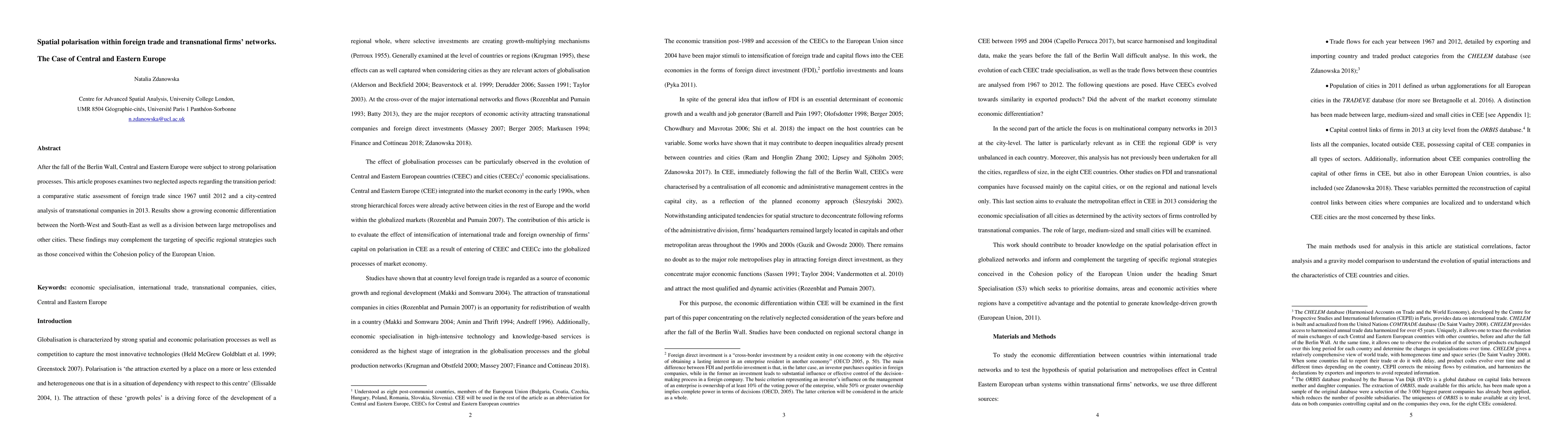 After the fall of the Berlin Wall, Central and Eastern Europe were subject to strong polarisation processes. This article proposes examines two neglected aspects regarding the transition period: a comparative static assessment of foreign trade since 1967 until 2012 and a city-centred analysis of transnational companies in 2013. Results show a growing economic differentiation between the North-West and South-East as well as a division between large metropolises and other cities. These findings may complement the targeting of specific regional strategies such as those conceived within the Cohesion policy of the European Union.