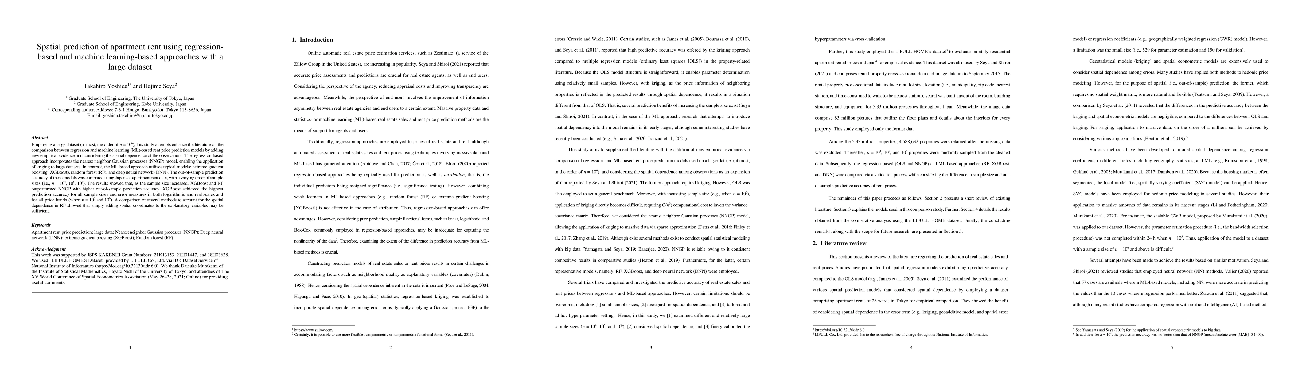This study compares regression and machine learning models for predicting Japanese apartment rents using a large dataset (up to n = 10^6). The regression model employs NNGP, while machine learning models include XGBoost, RF, and DNN. XGBoost and RF outperformed NNGP, with XGBoost achieving the highest prediction accuracy across all sample sizes and error measures.