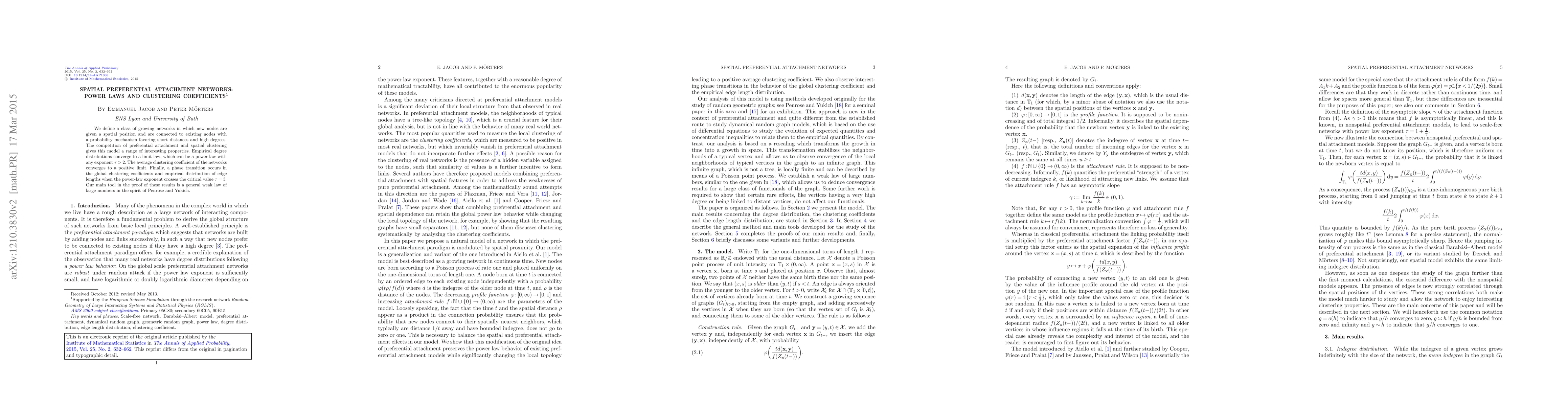 This paper introduces a spatial preferential attachment network model where new nodes are positioned spatially and preferentially connected to nearby high-degree nodes. The model exhibits a range of properties including power-law degree distributions and a positive limit for the average clustering coefficient, with a phase transition occurring at $\tau=3$.