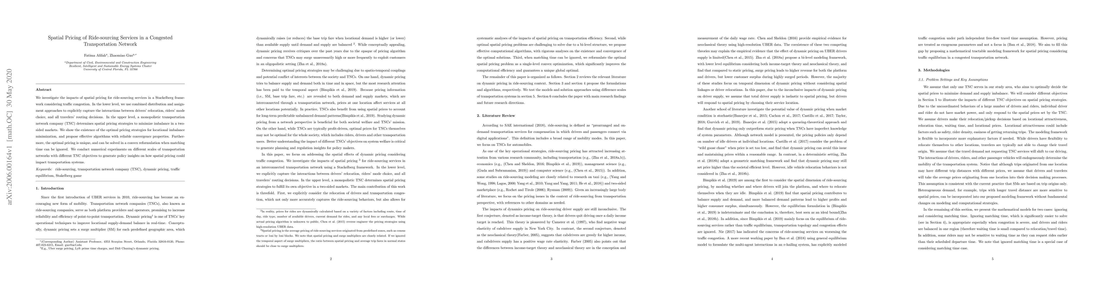 This paper explores spatial pricing strategies for ride-sourcing services in a congested transportation network using a Stackelberg framework, demonstrating the existence of optimal pricing strategies to minimize locational imbalance. It combines distribution and assignment models to capture driver and rider interactions and proposes algorithms for effective pricing determination.