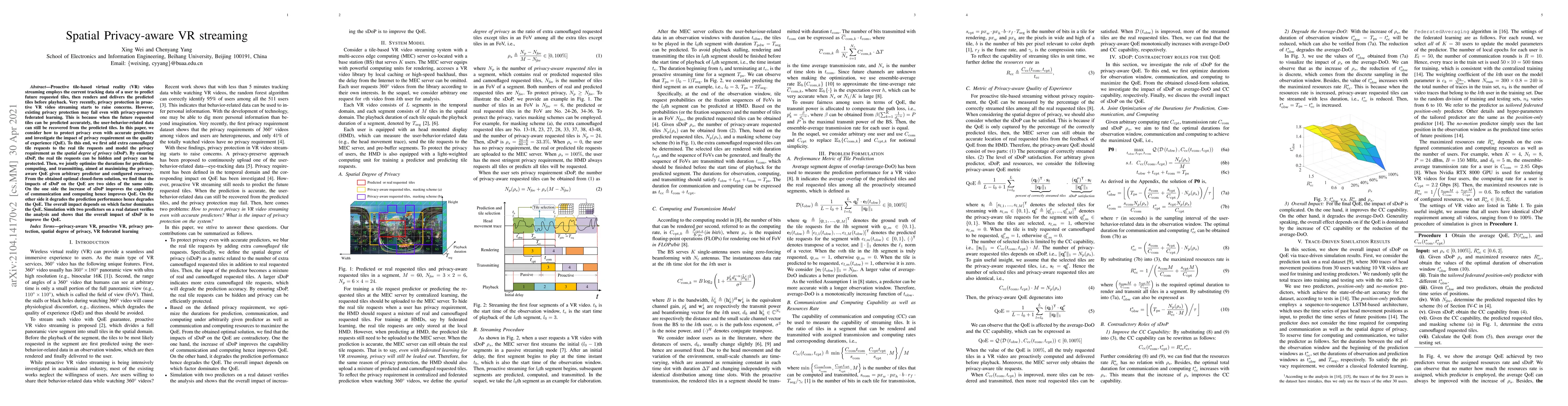 This paper proposes a method to protect privacy in proactive VR video streaming by adding camouflaged tile requests to hide real user behavior, modeling privacy as the spatial degree of privacy (sDoP). The study optimizes prediction, computing, and transmission durations to maximize privacy-aware quality of experience (QoE), finding that while higher sDoP improves privacy, it can degrade prediction performance and thus QoE, with overall impact depending on which factor dominates.
