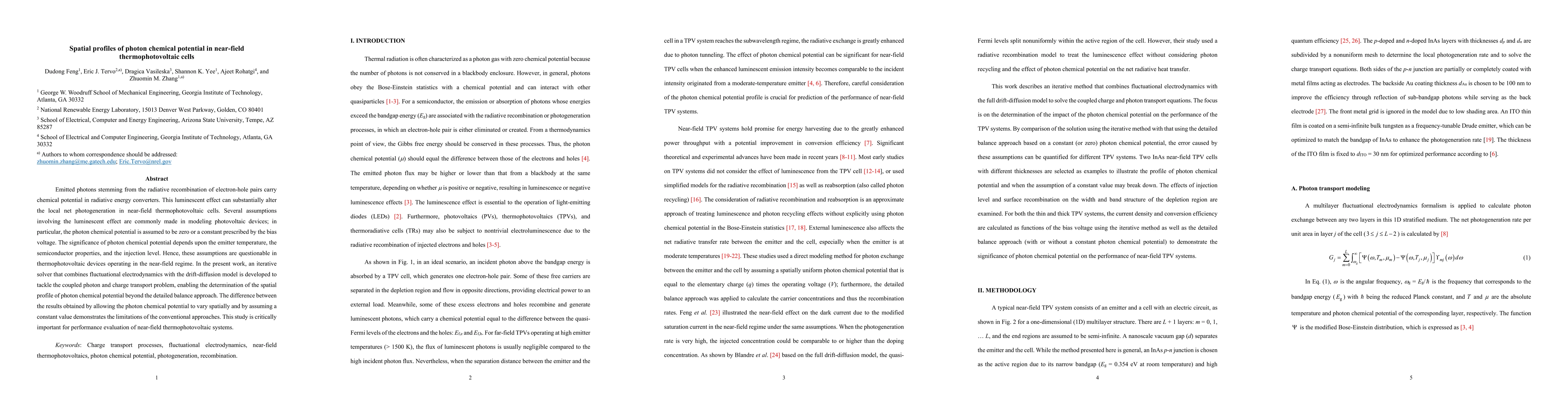 Emitted photons stemming from the radiative recombination of electron-hole pairs carry chemical potential in radiative energy converters. This luminescent effect can substantially alter the local net photogeneration in near-field thermophotovoltaic cells. Several assumptions involving the luminescent effect are commonly made in modeling photovoltaic devices; in particular, the photon chemical potential is assumed to be zero or a constant prescribed by the bias voltage. The significance of photon chemical potential depends upon the emitter temperature, the semiconductor properties, and the injection level. Hence, these assumptions are questionable in thermophotovoltaic devices operating in the near-field regime. In the present work, an iterative solver that combines fluctuational electrodynamics with the drift-diffusion model is developed to tackle the coupled photon and charge transport problem, enabling the determination of the spatial profile of photon chemical potential beyond the detailed balance approach. The difference between the results obtained by allowing the photon chemical potential to vary spatially and by assuming a constant value demonstrates the limitations of the conventional approaches. This study is critically important for performance evaluation of near-field thermophotovoltaic systems.