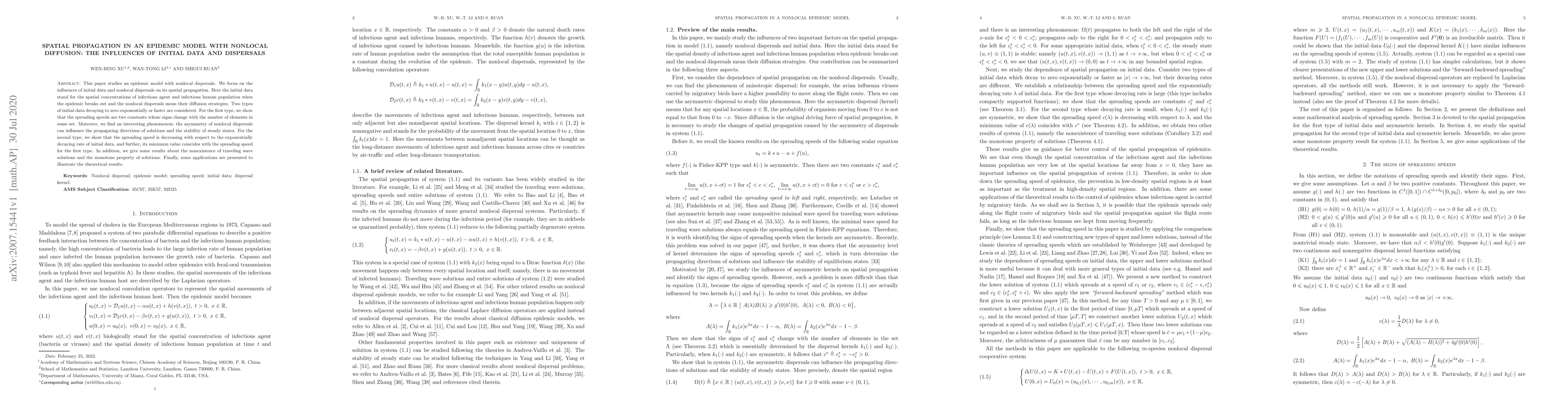 This paper investigates an epidemic model with nonlocal dispersals, examining how initial data and dispersal strategies affect spatial propagation. It reveals that the spreading speed and stability depend on the initial data type and the asymmetry in dispersal, with implications for traveling wave solutions and solution monotonicity.