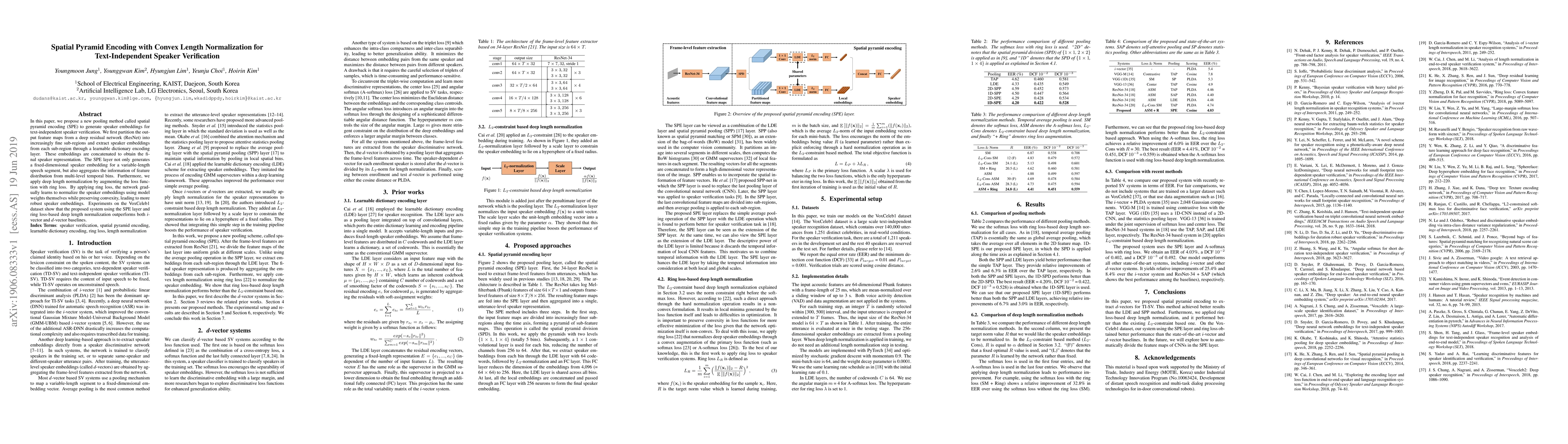 This paper introduces spatial pyramid encoding (SPE) for text-independent speaker verification, which partitions ResNet feature maps into sub-regions to extract embeddings, concatenates them for a robust representation, and applies deep length normalization with ring loss for enhanced robustness. The proposed method outperforms i-vector and d-vector baselines on VoxCeleb1.
