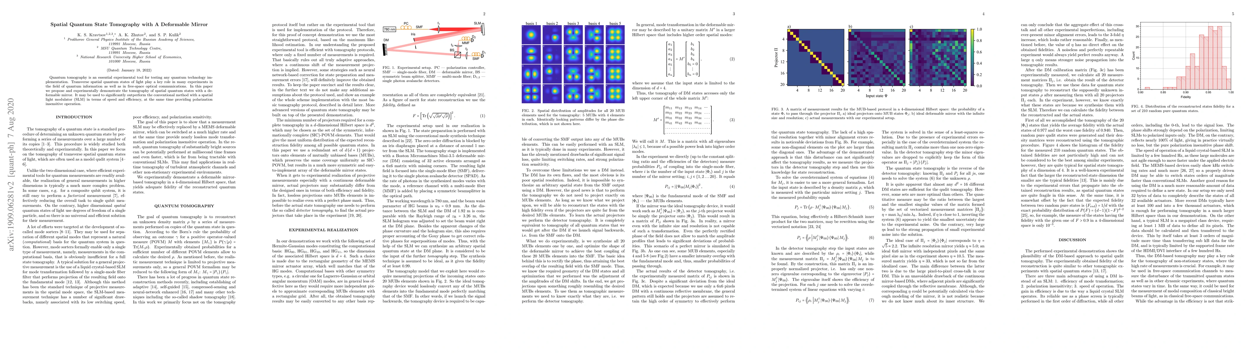 This paper proposes and demonstrates a method for spatial quantum state tomography using a deformable mirror, which offers improved speed, efficiency, and polarization-insensitive operation compared to conventional methods using a spatial light modulator (SLM).