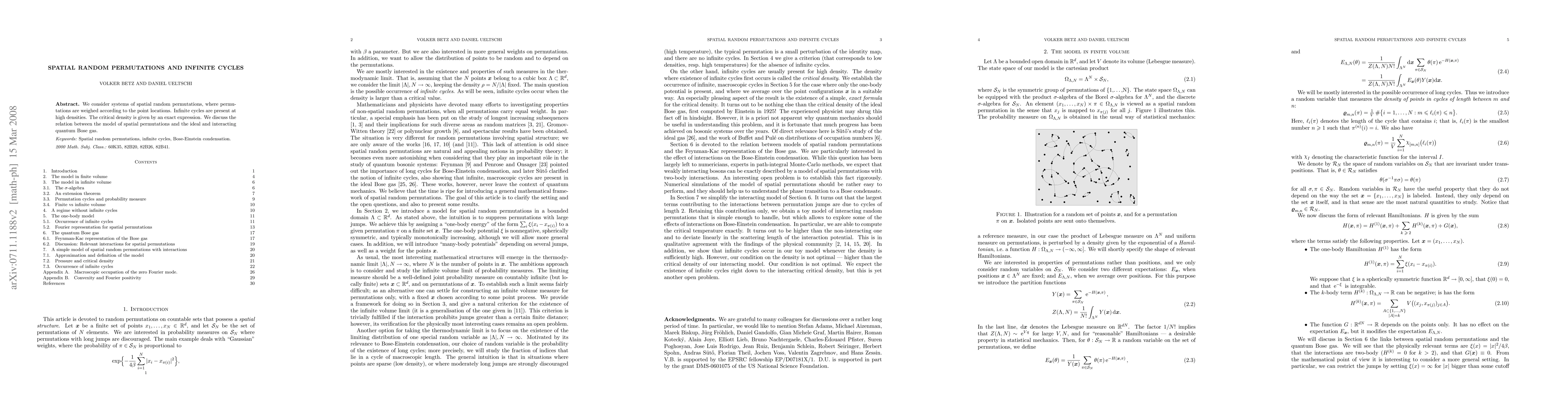 We consider systems of spatial random permutations, where permutations are weighed according to the point locations. Infinite cycles are present at high densities. The critical density is given by an exact expression. We discuss the relation between the model of spatial permutations and the ideal and interacting quantum Bose gas.