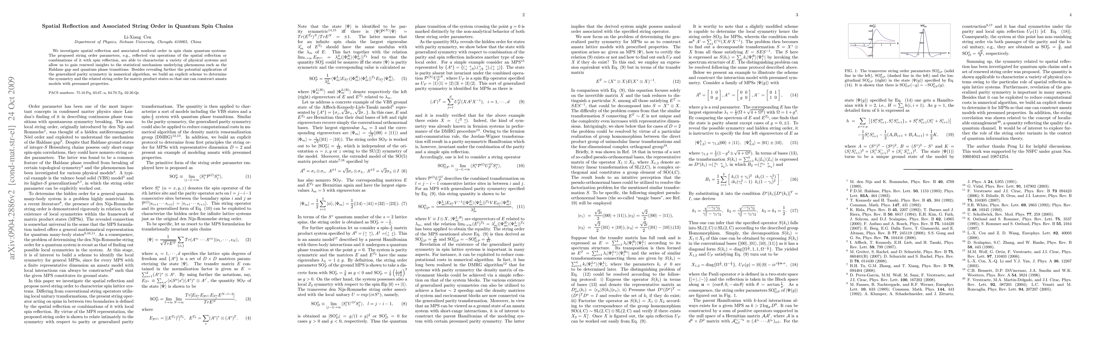 We investigate spatial reflection and associated nonlocal order in spin chain quantum systems. The proposed string order parameters, e.g., reflected via operations of the spatial reflection or combinations of it with spin reflection, are able to characterize a variety of physical systems and allow us to gain renewed insights to the statistical mechanism underlying phenomena such as the Haldane gap and quantum phase transitions. Besides revealing further the potential application of the generalized parity symmetry in numerical algorithm, we build an explicit scheme to determine the symmetry and the related string order for matrix product states so that one can construct ansatz models with presumed properties.