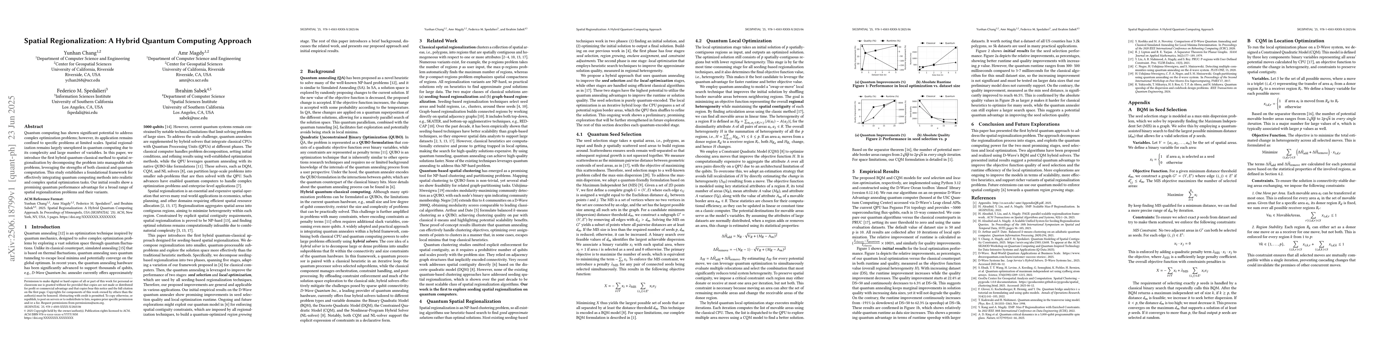 Quantum computing has shown significant potential to address complex optimization problems; however, its application remains confined to specific problems at limited scales. Spatial regionalization remains largely unexplored in quantum computing due to its complexity and large number of variables. In this paper, we introduce the first hybrid quantum-classical method to spatial regionalization by decomposing the problem into manageable subproblems, leveraging the strengths of both classical and quantum computation. This study establishes a foundational framework for effectively integrating quantum computing methods into realistic and complex spatial optimization tasks. Our initial results show a promising quantum performance advantage for a broad range of spatial regionalization problems and their variants.
