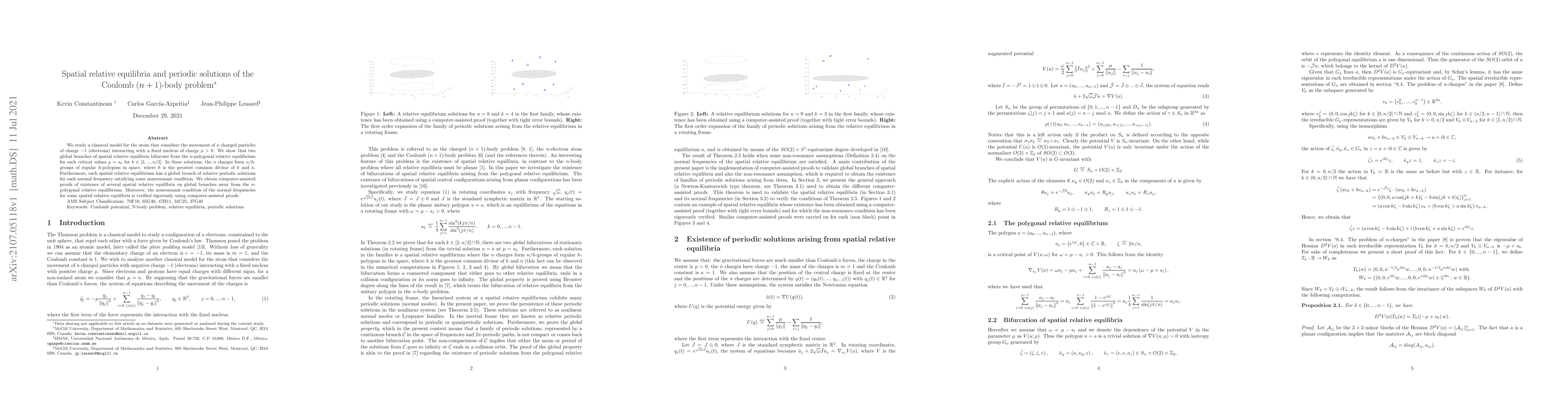We study a classical model for the atom that considers the movement of $n$ charged particles of charge $-1$ (electrons) interacting with a fixed nucleus of charge $\mu >0$. We show that two global branches of spatial relative equilibria bifurcate from the $n$-polygonal relative equilibrium for each critical values $\mu =s_{k}$ for $k\in \lbrack 2,...,n/2]$. In these solutions, the $n$ charges form $n/h$-groups of regular $h$-polygons in space, where $h$ is the greatest common divisor of $k$ and $n$. Furthermore, each spatial relative equilibrium has a global branch of relative periodic solutions for each normal frequency satisfying some nonresonant condition. We obtain computer-assisted proofs of the existence of several spatial relative equilibria on global branches away from the $n$-polygonal relative equilibrium. Moreover, the nonresonant condition of the normal frequencies for some spatial relative equilibria is verified rigorously using computer-assisted proofs.