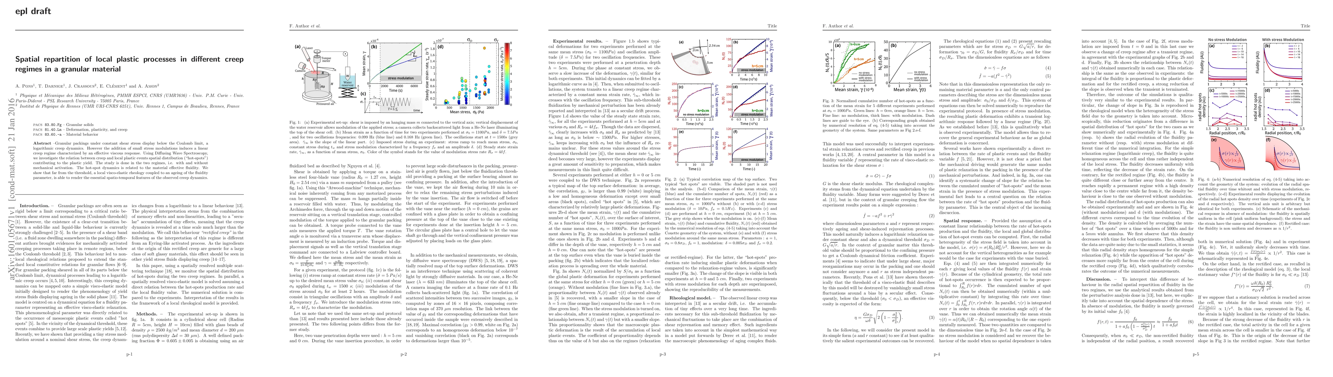 This study investigates the spatial repartition of local plastic processes ("hot-spots") in granular materials under different creep regimes, using Diffusing Wave Spectroscopy to analyze the dynamics. It reveals that the addition of small stress modulations induces a linear creep regime, and the hot-spot dynamics are linked to the material's effective fluidity, with a local visco-elastic rheology explaining the observed spatio-temporal features.
