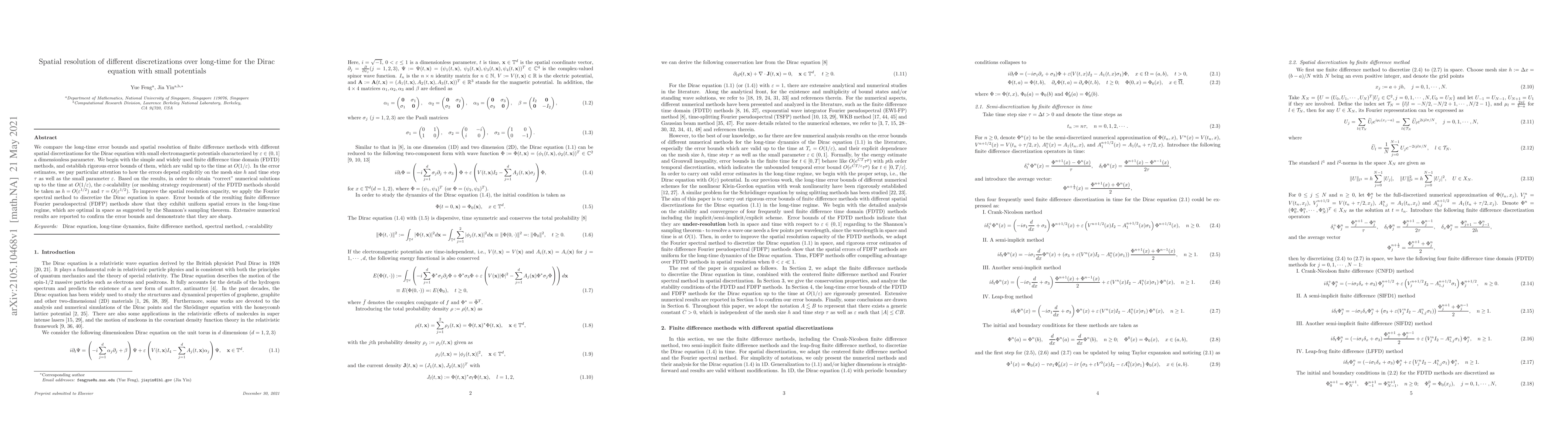 We compare the long-time error bounds and spatial resolution of finite difference methods with different spatial discretizations for the Dirac equation with small electromagnetic potentials characterized by $\varepsilon \in (0, 1]$ a dimensionless parameter. We begin with the simple and widely used finite difference time domain (FDTD) methods, and establish rigorous error bounds of them, which are valid up to the time at $O(1/\varepsilon)$. In the error estimates, we pay particular attention to how the errors depend explicitly on the mesh size $h$ and time step $\tau$ as well as the small parameter $\varepsilon$. Based on the results, in order to obtain "correct" numerical solutions up to the time at $O(1/\varepsilon)$, the $\varepsilon$-scalability (or meshing strategy requirement) of the FDTD methods should be taken as $h = O(\varepsilon^{1/2})$ and $\tau = O(\varepsilon^{1/2})$. To improve the spatial resolution capacity, we apply the Fourier spectral method to discretize the Dirac equation in space. Error bounds of the resulting finite difference Fourier pseudospectral (FDFP) methods show that they exhibit uniform spatial errors in the long-time regime, which are optimal in space as suggested by the Shannon's sampling theorem. Extensive numerical results are reported to confirm the error bounds and demonstrate that they are sharp.