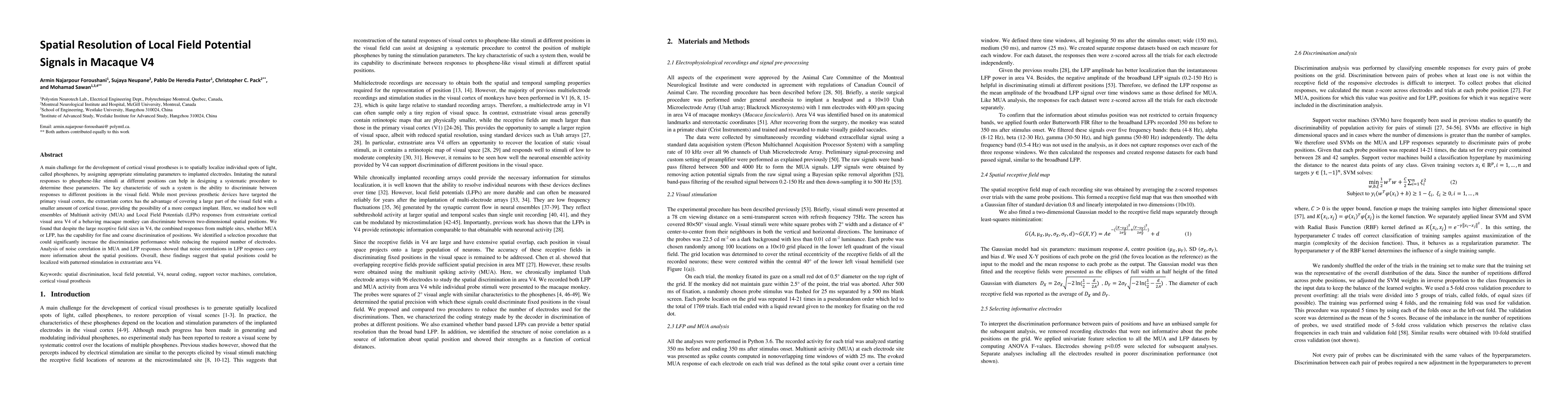 A main challenge for the development of cortical visual prostheses is to spatially localize individual spots of light, called phosphenes, by assigning appropriate stimulating parameters to implanted electrodes. Imitating the natural responses to phosphene-like stimuli at different positions can help in designing a systematic procedure to determine these parameters. The key characteristic of such a system is the ability to discriminate between responses to different positions in the visual field. While most previous prosthetic devices have targeted the primary visual cortex, the extrastriate cortex has the advantage of covering a large part of the visual field with a smaller amount of cortical tissue, providing the possibility of a more compact implant. Here, we studied how well ensembles of Multiunit activity (MUA) and Local Field Potentials (LFPs) responses from extrastriate cortical visual area V4 of a behaving macaque monkey can discriminate between two-dimensional spatial positions. We found that despite the large receptive field sizes in V4, the combined responses from multiple sites, whether MUA or LFP, has the capability for fine and coarse discrimination of positions. We identified a selection procedure that could significantly increase the discrimination performance while reducing the required number of electrodes. Analysis of noise correlation in MUA and LFP responses showed that noise correlations in LFP responses carry more information about the spatial positions. Overall, these findings suggest that spatial positions could be localized with patterned stimulation in extrastriate area V4.
