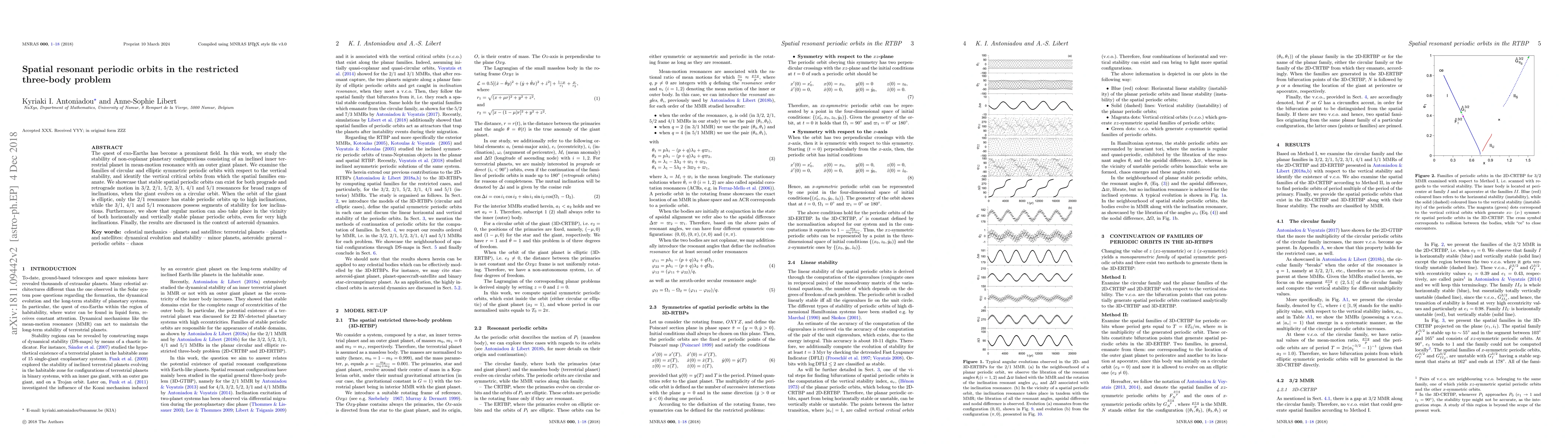 This paper investigates the stability of non-coplanar planetary configurations in mean-motion resonance within the restricted three-body problem, identifying stable spatial periodic orbits for various resonances. It finds that stable orbits exist for broad inclination ranges, but the stability varies with the eccentricity of the outer giant planet's orbit.