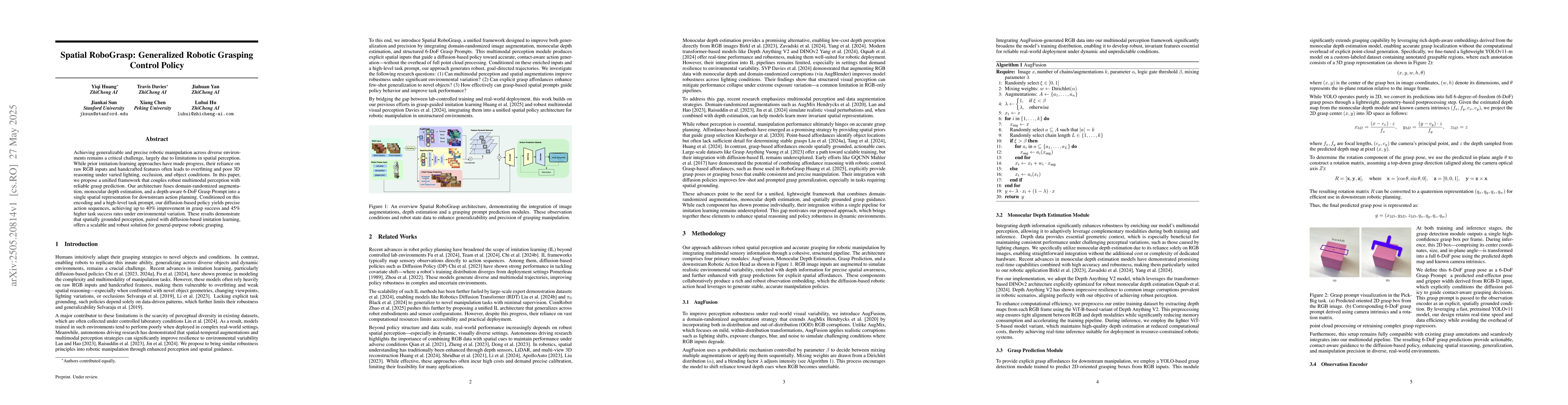 Achieving generalizable and precise robotic manipulation across diverse environments remains a critical challenge, largely due to limitations in spatial perception. While prior imitation-learning approaches have made progress, their reliance on raw RGB inputs and handcrafted features often leads to overfitting and poor 3D reasoning under varied lighting, occlusion, and object conditions. In this paper, we propose a unified framework that couples robust multimodal perception with reliable grasp prediction. Our architecture fuses domain-randomized augmentation, monocular depth estimation, and a depth-aware 6-DoF Grasp Prompt into a single spatial representation for downstream action planning. Conditioned on this encoding and a high-level task prompt, our diffusion-based policy yields precise action sequences, achieving up to 40% improvement in grasp success and 45% higher task success rates under environmental variation. These results demonstrate that spatially grounded perception, paired with diffusion-based imitation learning, offers a scalable and robust solution for general-purpose robotic grasping.