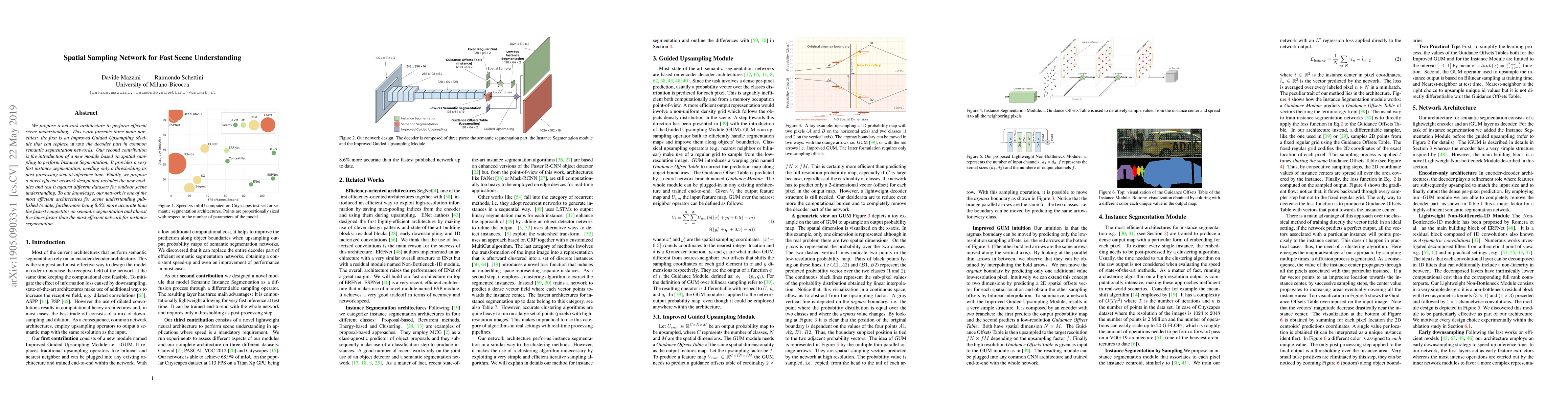 We propose a network architecture to perform efficient scene understanding. This work presents three main novelties: the first is an Improved Guided Upsampling Module that can replace in toto the decoder part in common semantic segmentation networks. Our second contribution is the introduction of a new module based on spatial sampling to perform Instance Segmentation. It provides a very fast instance segmentation, needing only thresholding as post-processing step at inference time. Finally, we propose a novel efficient network design that includes the new modules and test it against different datasets for outdoor scene understanding. To our knowledge, our network is one of the themost efficient architectures for scene understanding published to date, furthermore being 8.6% more accurate than the fastest competitor on semantic segmentation and almost five times faster than the most efficient network for instance segmentation.