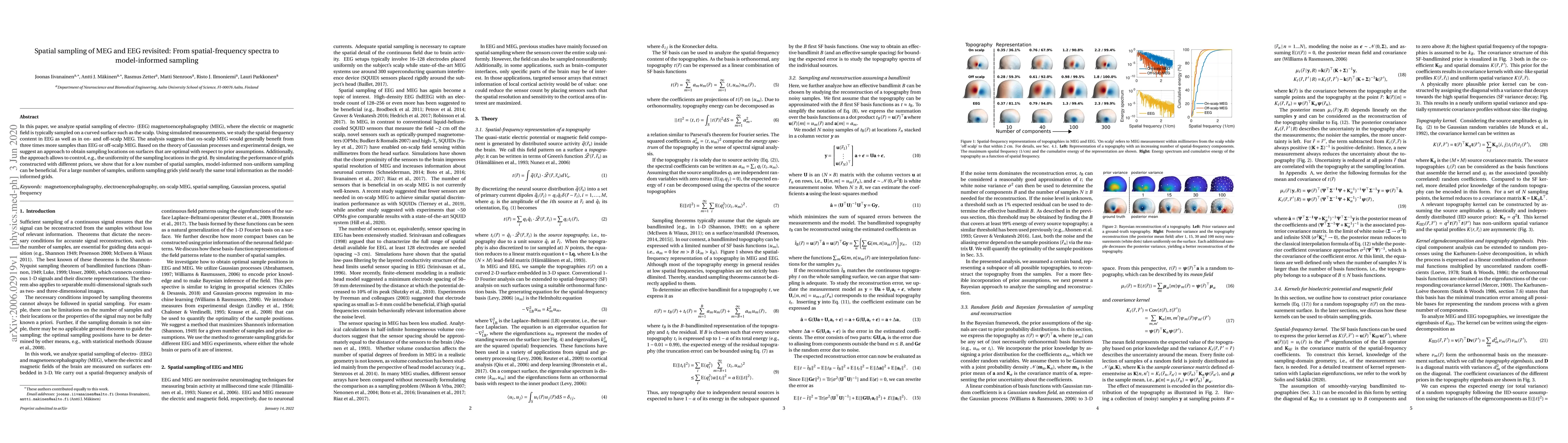 In this paper, we analyze spatial sampling of electro- (EEG) magnetoencephalography (MEG), where the electric or magnetic field is typically sampled on a curved surface such as the scalp. Using simulated measurements, we study the spatial-frequency content in EEG as well as in on- and off-scalp MEG. The analysis suggests that on-scalp MEG would generally benefit from three times more samples than EEG or off-scalp MEG. Based on the theory of Gaussian processes and experimental design, we suggest an approach to obtain sampling locations on surfaces that are optimal with respect to prior assumptions. Additionally, the approach allows to control, e.g., the uniformity of the sampling locations in the grid. By simulating the performance of grids constructed with different priors, we show that for a low number of spatial samples, model-informed non-uniform sampling can be beneficial. For a large number of samples, uniform sampling grids yield nearly the same total information as the model-informed grids.
