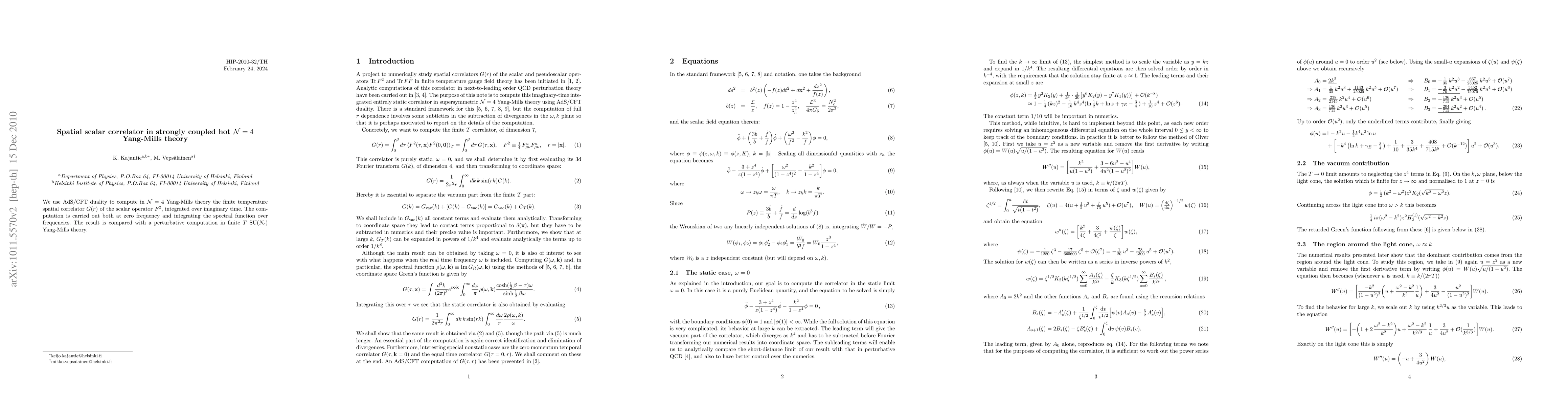 This paper computes the finite temperature spatial correlator of the scalar operator F^2 in N=4 Yang-Mills theory using AdS/CFT duality and compares its results to perturbative computations in finite temperature SU(N_c) Yang-Mills theory. The findings offer insights into strongly coupled hot gauge theories.