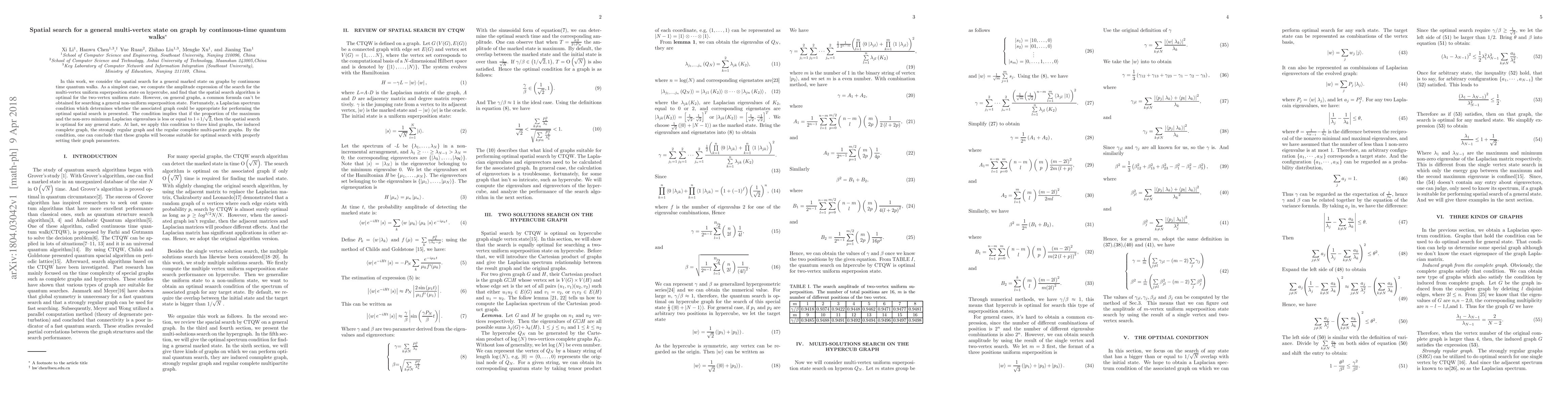 This paper investigates spatial search on graphs using continuous-time quantum walks, finding optimal search for a two-vertex state on hypercubes. It proposes a Laplacian spectrum condition for optimal search on general graphs, concluding that if the ratio of the maximum and non-zero minimum Laplacian eigenvalues is ≤ 1+√(1/2), the search is optimal, and applies this to induced complete, strongly regular, and regular complete multi-partite graphs.