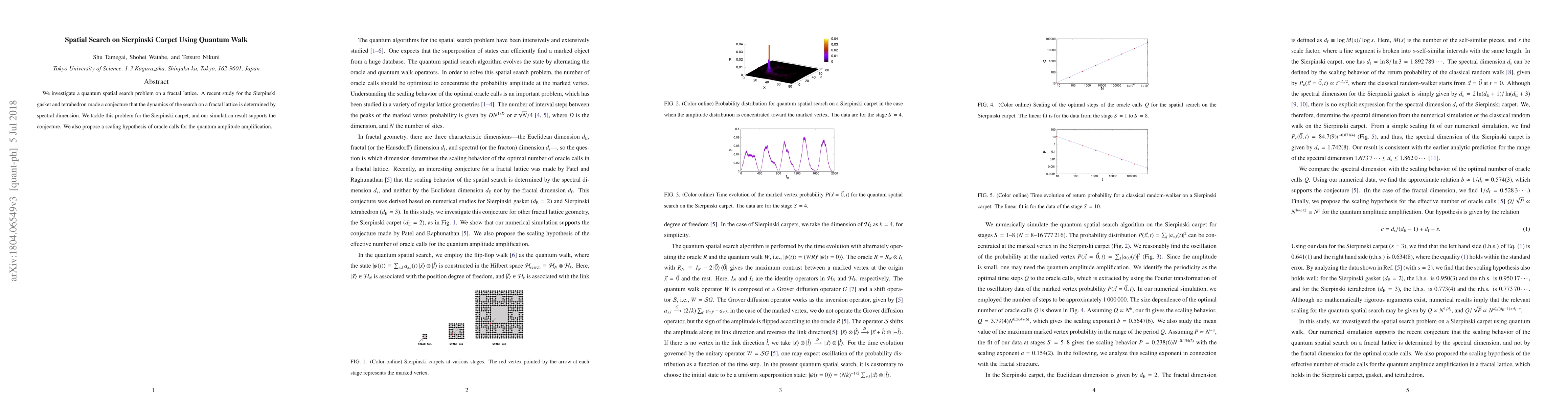 This paper explores quantum spatial search on a Sierpinski carpet fractal lattice, confirming a conjecture that the search dynamics are governed by the spectral dimension. The study proposes a scaling hypothesis for oracle calls in quantum amplitude amplification based on simulation results.