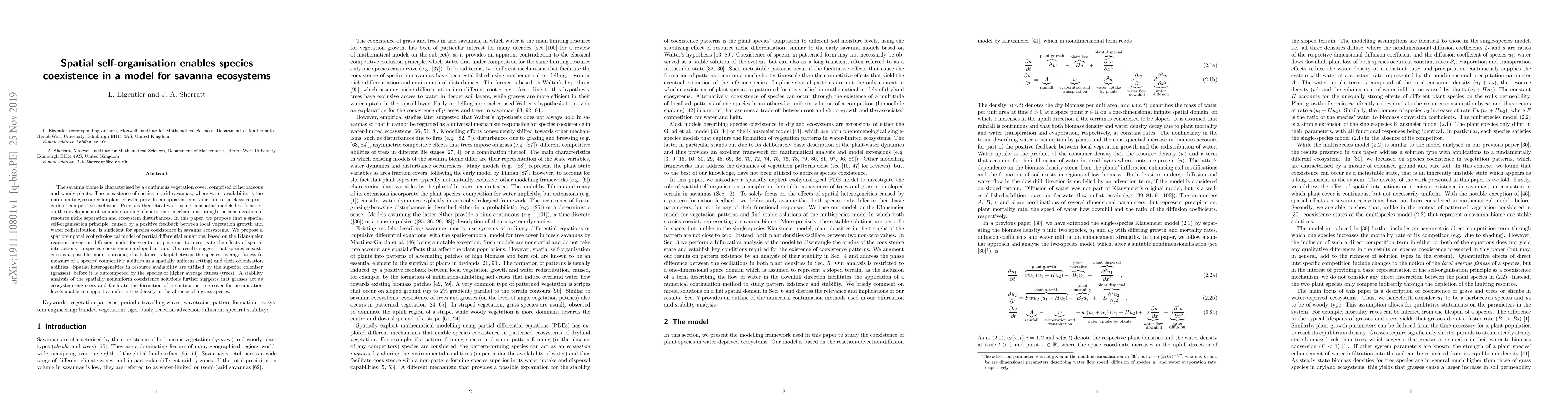 This paper proposes that spatial self-organisation, driven by positive feedback between vegetation growth and water redistribution, enables species coexistence in savanna ecosystems. Using a spatiotemporal ecohydrological model, it demonstrates that grasses, as superior colonisers, create spatial heterogeneities that facilitate coexistence, even under conditions where trees alone cannot maintain a uniform density.