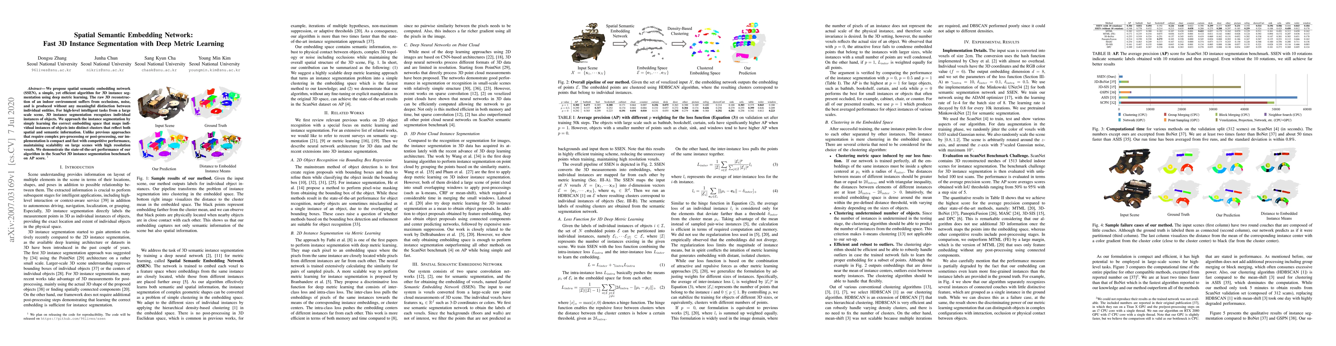 The paper proposes a Spatial Semantic Embedding Network (SSEN) for fast 3D instance segmentation using deep metric learning, achieving competitive performance without complex pre- or post-processing. The method maps individual object instances into distinct clusters reflecting spatial and semantic information, demonstrating state-of-the-art results on the ScanNet benchmark.