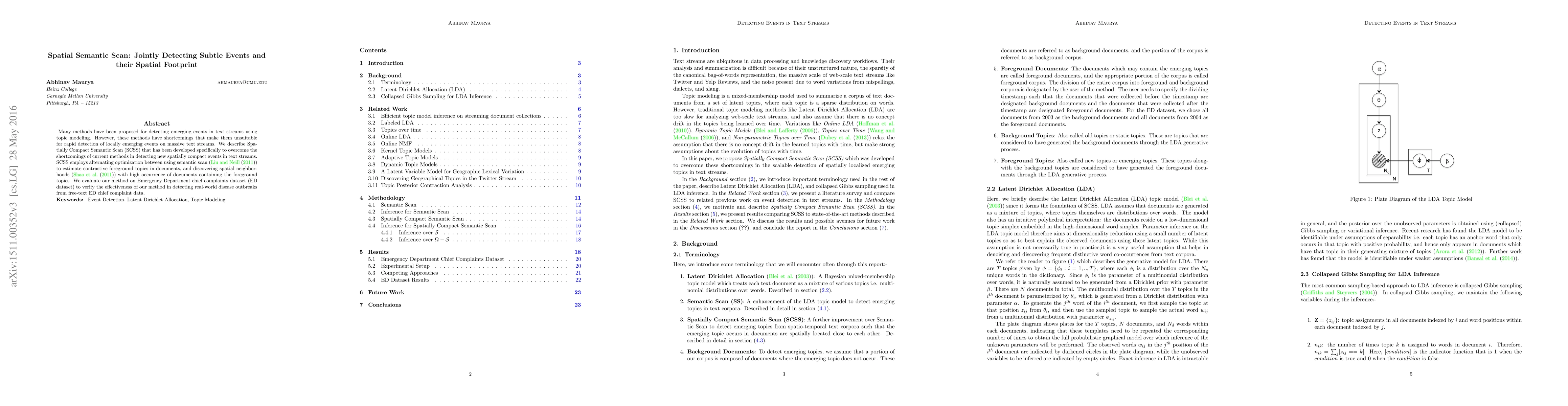 The Spatially Compact Semantic Scan (SCSS) method is designed to detect emerging, spatially compact events in massive text streams by combining semantic scan techniques with spatial neighborhood discovery. Evaluated on the Emergency Department chief complaints dataset, SCSS demonstrates effectiveness in identifying real-world disease outbreaks from free-text data.