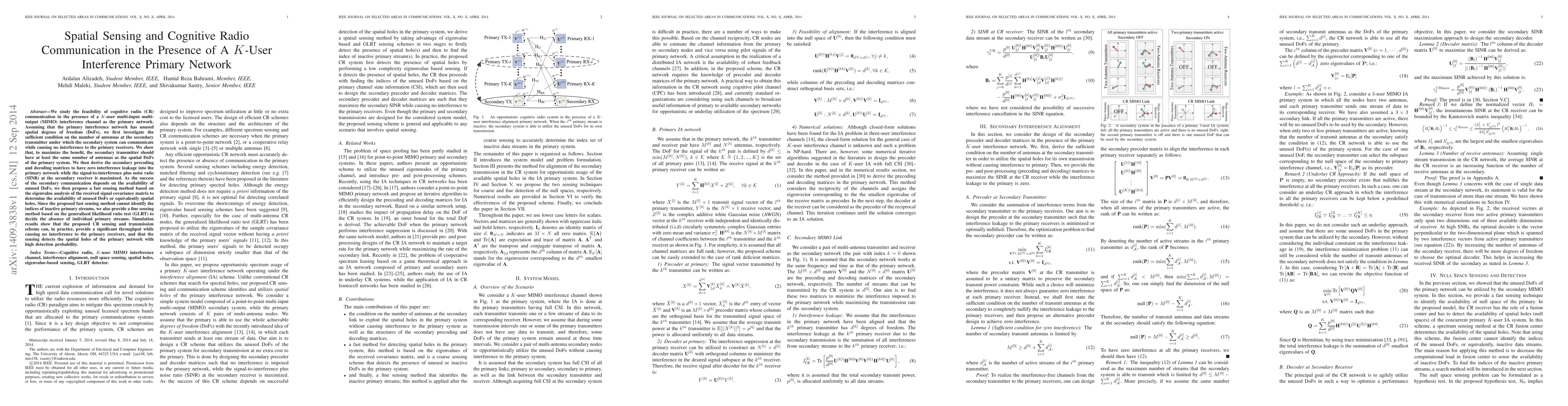 This paper explores the feasibility of cognitive radio communication in a $K$-user MIMO interference channel, where the primary network has unused spatial degrees of freedom. It proposes methods to ensure the secondary system communicates without interfering with the primary network, and introduces a fast sensing method based on eigenvalue analysis to detect unused spatial degrees of freedom.