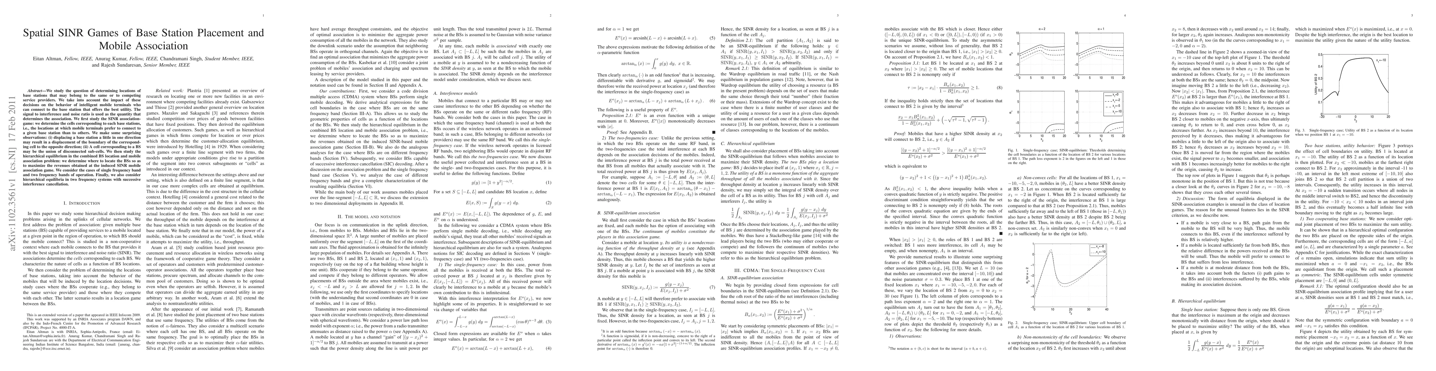 We study the question of determining locations of base stations that may belong to the same or to competing service providers. We take into account the impact of these decisions on the behavior of intelligent mobile terminals who can connect to the base station that offers the best utility. The signal to interference and noise ratio is used as the quantity that determines the association. We first study the SINR association-game: we determine the cells corresponding to each base stations, i.e., the locations at which mobile terminals prefer to connect to a given base station than to others. We make some surprising observations: (i) displacing a base station a little in one direction may result in a displacement of the boundary of the corresponding cell to the opposite direction; (ii) A cell corresponding to a BS may be the union of disconnected sub-cells. We then study the hierarchical equilibrium in the combined BS location and mobile association problem: we determine where to locate the BSs so as to maximize the revenues obtained at the induced SINR mobile association game. We consider the cases of single frequency band and two frequency bands of operation. Finally, we also consider hierarchical equilibria in two frequency systems with successive interference cancellation.
