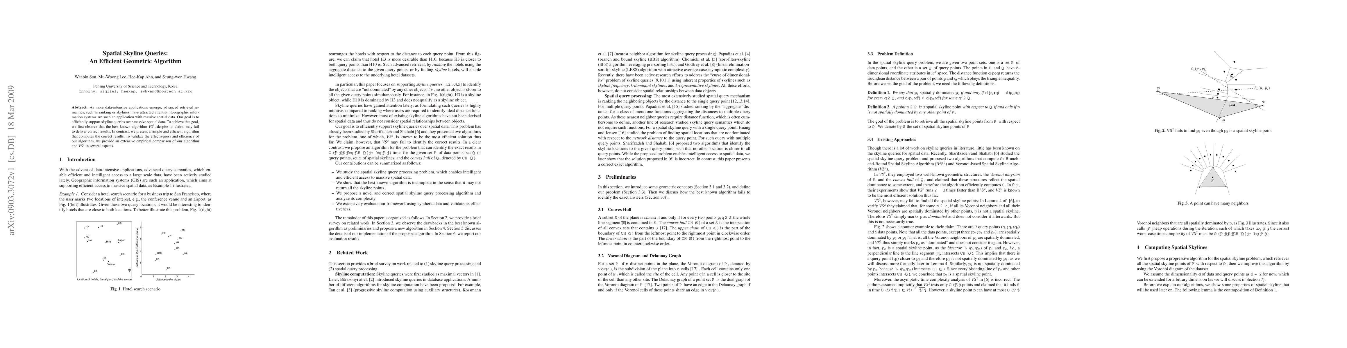 This paper proposes an efficient algorithm for spatial skyline queries over massive spatial data, addressing the inaccuracy of the previously best-known algorithm VS2. The new algorithm is validated through extensive empirical comparisons, demonstrating its effectiveness and efficiency.