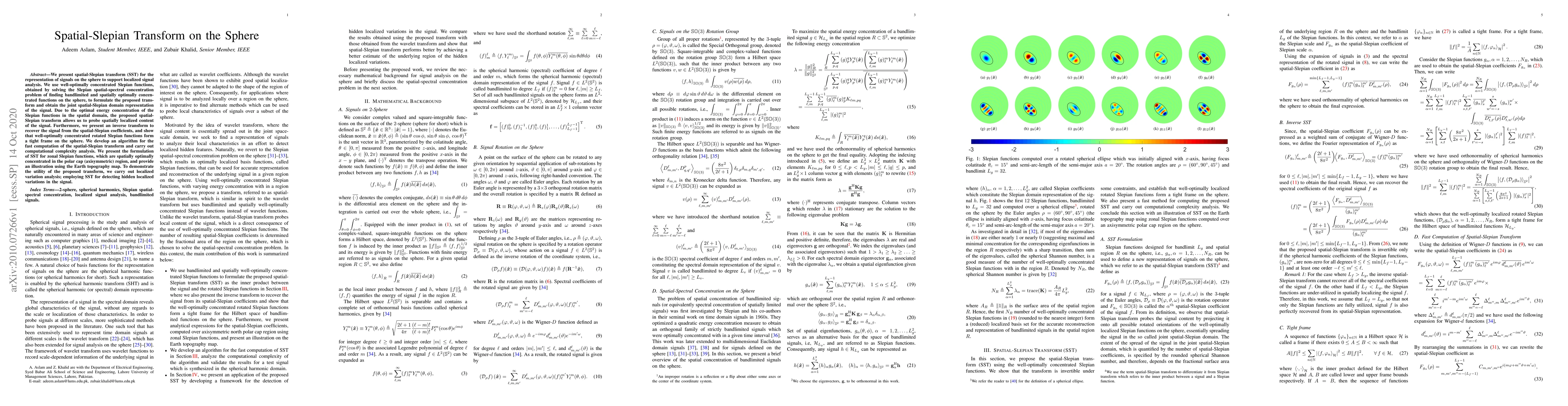 The spatial-Slepian transform (SST) is introduced for localized signal analysis on the sphere, utilizing optimally concentrated Slepian functions to achieve joint spatial-Slepian domain representation. The transform enables detection of localized signal variations and includes an inverse transform, fast computation algorithm, and complexity analysis.