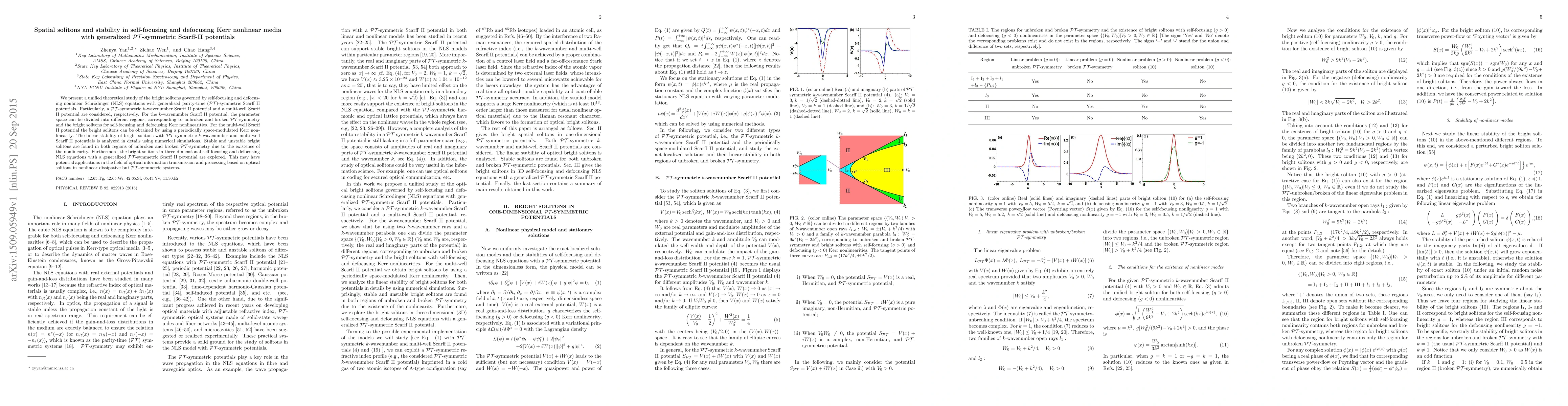 We present a unified theoretical study of the bright solitons governed by self-focusing and defocusing nonlinear Schrodinger (NLS) equations with generalized parity-time (PT)-symmetric Scarff II potentials. Particularly, a PT-symmetric k-wavenumber Scarff II potential and a multi-well Scarff II potential are considered, respectively. For the k-wavenumber Scarff II potential, the parameter space can be divided into different regions, corresponding to unbroken and broken PT-symmetry and the bright solitons for self-focusing and defocusing Kerr nonlinearities. For the multi-well Scarff II potential the bright solitons can be obtained by using a periodically space-modulated Kerr nonlinearity. The linear stability of bright solitons with PT-symmetric k-wavenumber and multi-well Scarff II potentials is analyzed in details using numerical simulations. Stable and unstable bright solitons are found in both regions of unbroken and broken PT-symmetry due to the existence of the nonlinearity. Furthermore, the bright solitons in three-dimensional self-focusing and defocusing NLS equations with a generalized PT-symmetric Scarff II potential are explored. This may have potential applications in the field of optical information transmission and processing based on optical solitons in nonlinear dissipative but PT-symmetric systems.