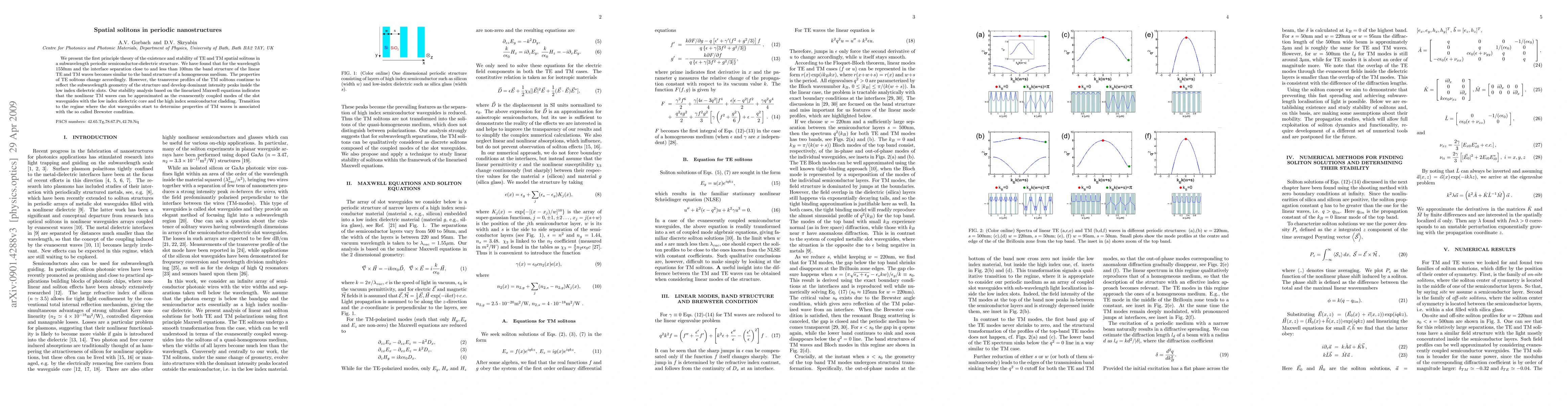 This paper presents a first-principle theory on the existence and stability of TE and TM spatial solitons in subwavelength periodic nano-structures. It finds that TM solitons develop dominant intensity peaks in low index dielectric slots, while TE solitons' properties change due to the similarity in band structure to a homogeneous medium, especially at 1550nm wavelength and interface separations less than 100nm.