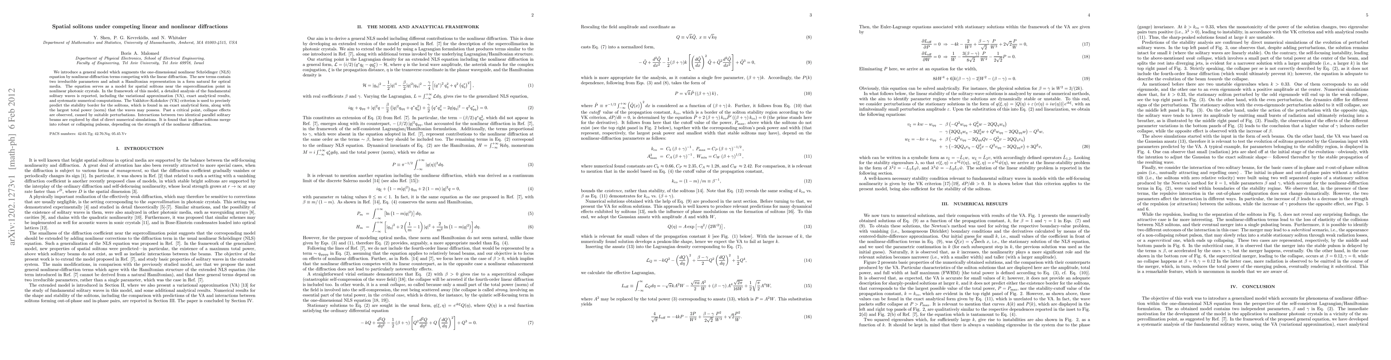 We introduce a general model which augments the one-dimensional nonlinear Schr\"{o}dinger (NLS) equation by nonlinear-diffraction terms competing with the linear diffraction. The new terms contain two irreducible parameters and admit a Hamiltonian representation in a form natural for optical media. The equation serves as a model for spatial solitons near the supercollimation point in nonlinear photonic crystals. In the framework of this model, a detailed analysis of the fundamental solitary waves is reported, including the variational approximation (VA), exact analytical results, and systematic numerical computations. The Vakhitov-Kolokolov (VK) criterion is used to precisely predict the stability border for the solitons, which is found in an exact analytical form, along with the largest total power (norm) that the waves may possess. Past a critical point, collapse effects are observed, caused by suitable perturbations. Interactions between two identical parallel solitary beams are explored by dint of direct numerical simulations. It is found that in-phase solitons merge into robust or collapsing pulsons, depending on the strength of the nonlinear diffraction.