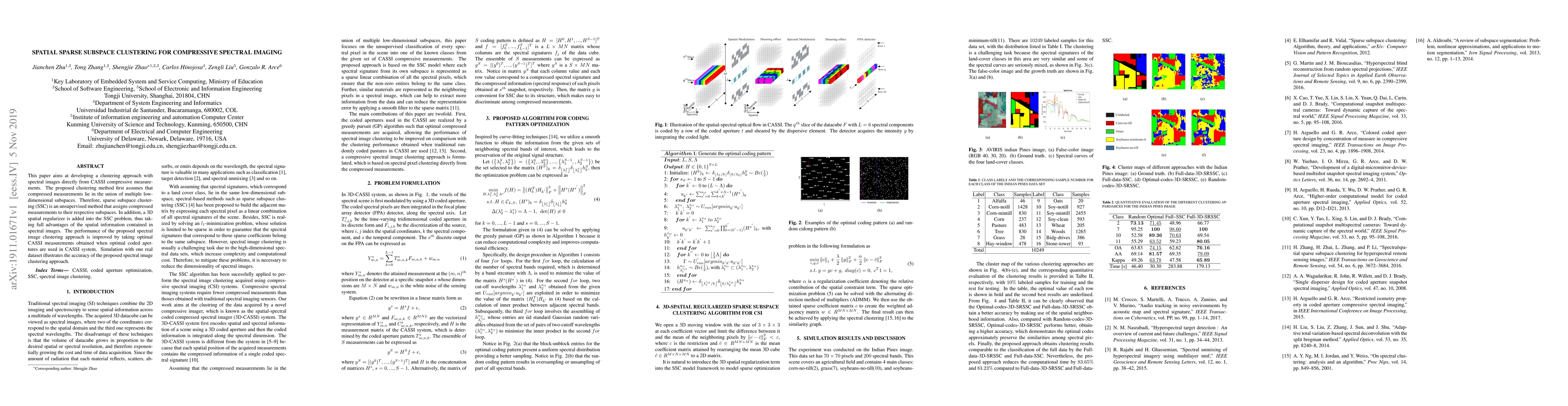 This paper aims at developing a clustering approach with spectral images directly from CASSI compressive measurements. The proposed clustering method first assumes that compressed measurements lie in the union of multiple low-dimensional subspaces. Therefore, sparse subspace clustering (SSC) is an unsupervised method that assigns compressed measurements to their respective subspaces. In addition, a 3D spatial regularizer is added into the SSC problem, thus taking full advantages of the spatial information contained in spectral images. The performance of the proposed spectral image clustering approach is improved by taking optimal CASSI measurements obtained when optimal coded apertures are used in CASSI system. Simulation with one real dataset illustrates the accuracy of the proposed spectral image clustering approach.