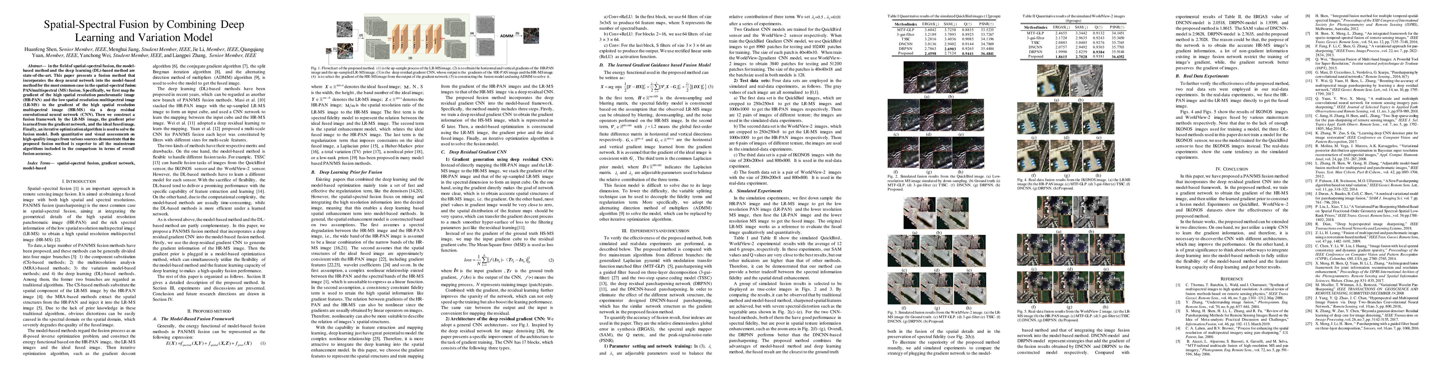 This paper proposes a spatial-spectral fusion method that integrates deep learning with a model-based approach for PAN/MS image fusion. It uses a deep residual CNN to map gradients and an iterative optimization algorithm to construct a superior fusion framework, outperforming existing methods in both quantitative and visual assessments.