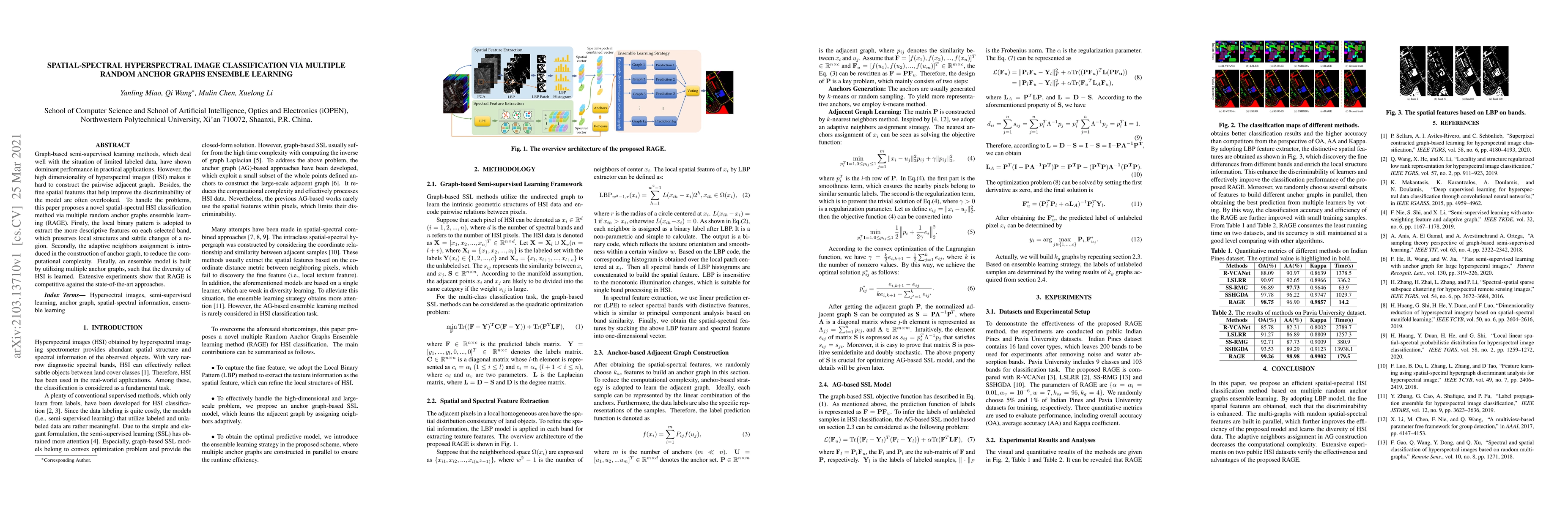 This paper proposes a spatial-spectral hyperspectral image classification method using multiple random anchor graphs ensemble learning (RAGE) to address the challenges of high dimensionality and limited labeled data. The method extracts descriptive features via local binary patterns and constructs adaptive neighbor graphs to reduce complexity, achieving competitive classification performance.