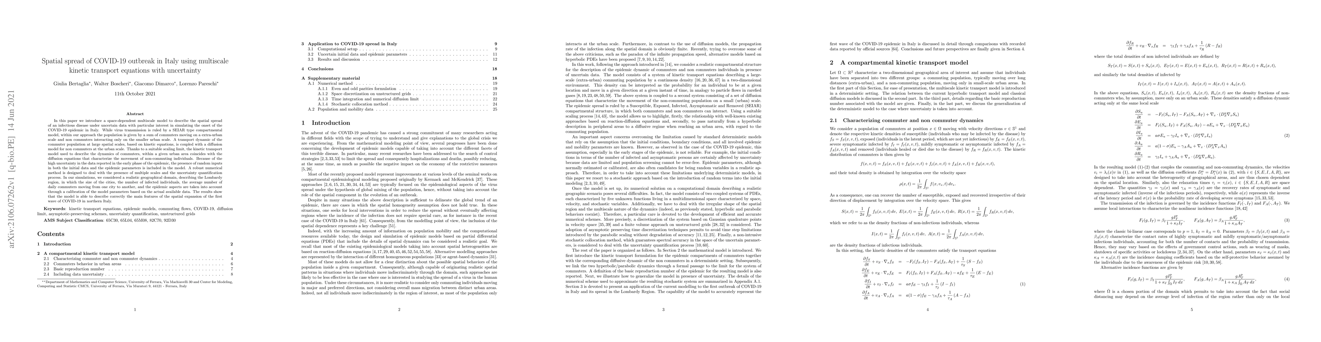 This paper presents a multiscale kinetic transport model to simulate the spatial spread of COVID-19 in Italy, distinguishing between commuters and non-commuters. The model incorporates uncertainty in early data and parameters, and demonstrates its ability to accurately describe the initial wave of the pandemic in northern Italy.