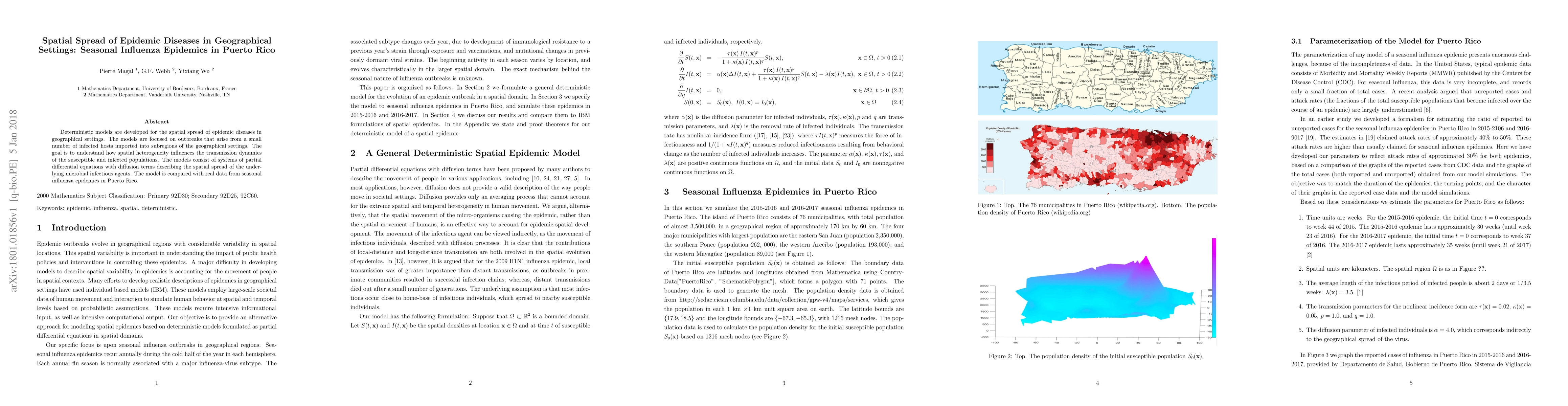 This paper develops deterministic models to understand the spatial spread of seasonal influenza in Puerto Rico, focusing on how spatial heterogeneity affects transmission dynamics. The models use partial differential equations with diffusion terms and are validated against real epidemic data.