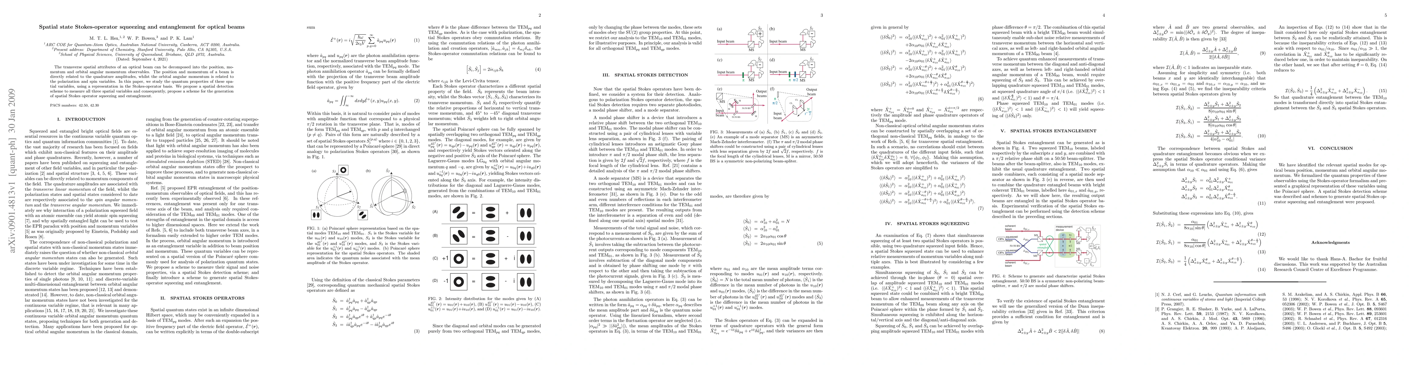 The transverse spatial attributes of an optical beam can be decomposed into the position, momentum and orbital angular momentum observables. The position and momentum of a beam is directly related to the quadrature amplitudes, whilst the orbital angular momentum is related to the polarization and spin variables. In this paper, we study the quantum properties of these spatial variables, using a representation in the Stokes-operator basis. We propose a spatial detection scheme to measure all three spatial variables and consequently, propose a scheme for the generation of spatial Stokes operator squeezing and entanglement.
