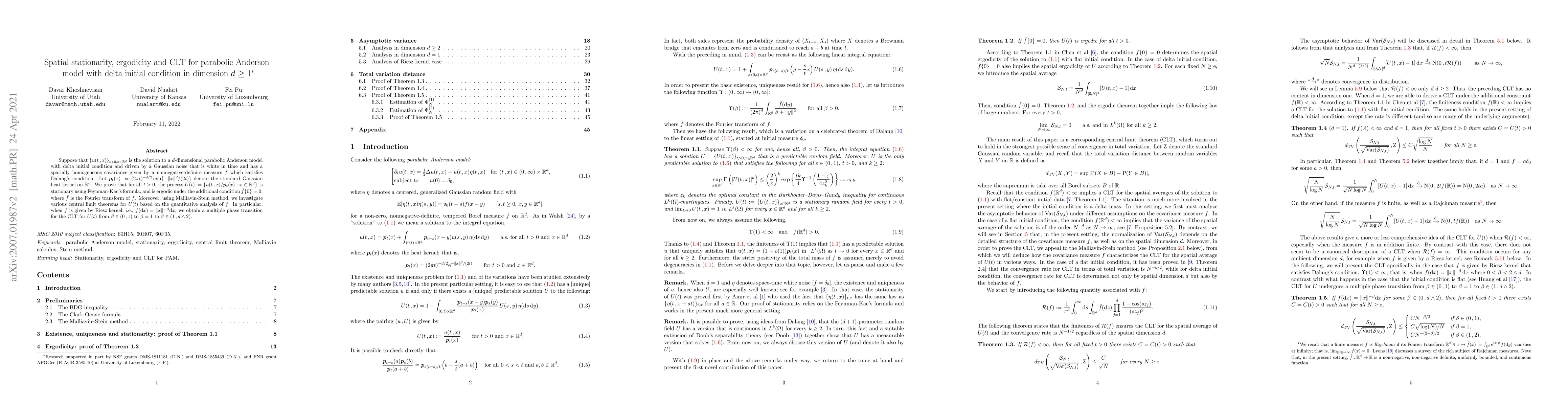This paper investigates the spatial stationarity, ergodicity, and central limit theorems (CLT) for a $d$-dimensional parabolic Anderson model with a delta initial condition. It proves stationarity and ergodicity under specific conditions, and explores CLTs based on the quantitative analysis of the driving noise's covariance, revealing a multiple phase transition in the CLT as the kernel parameter varies.