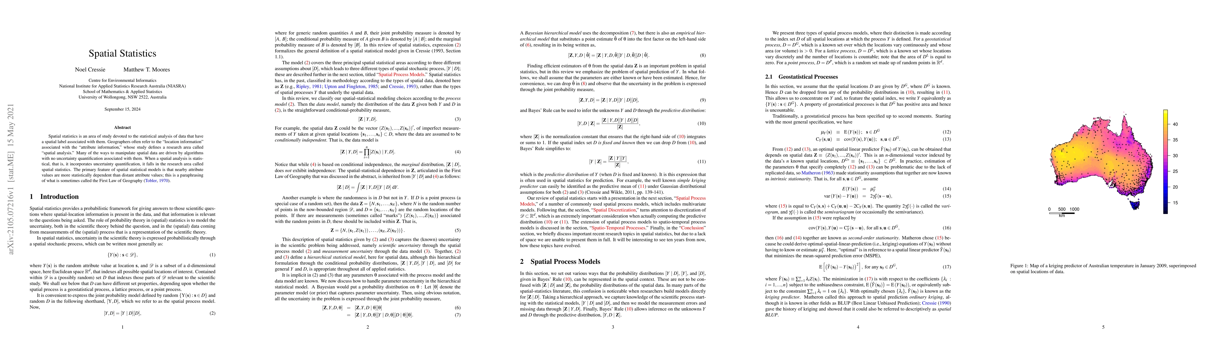 This paper introduces spatial statistics as a field that analyzes data with location information, focusing on statistical dependence between nearby attribute values. It highlights the importance of uncertainty quantification in spatial analysis and its alignment with the First Law of Geography.