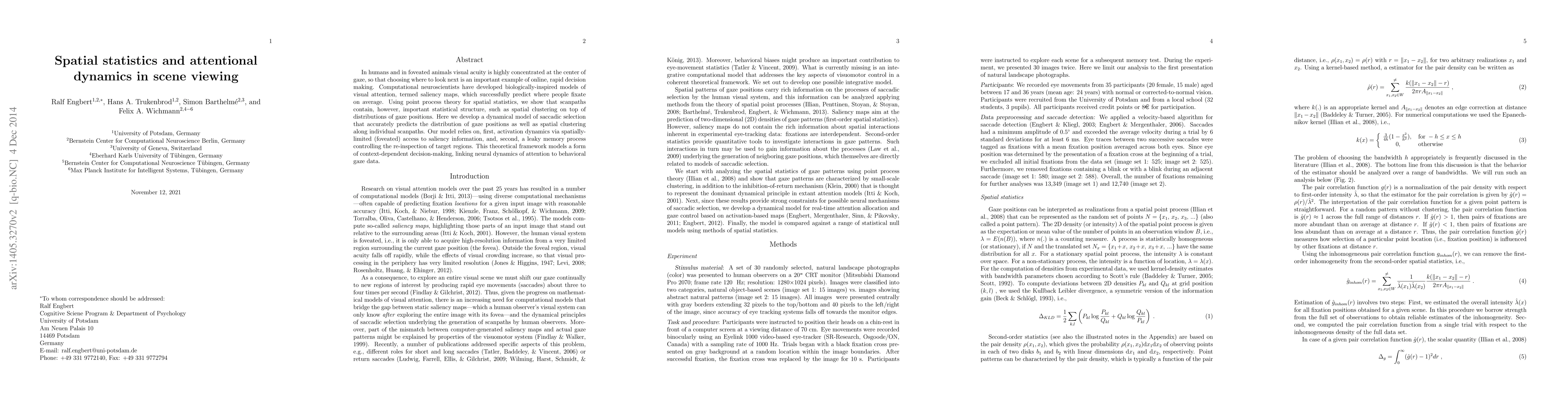 The paper presents a dynamical model that predicts both the distribution of gaze positions and spatial clustering in scanpaths during scene viewing. This model combines activation dynamics based on foveated saliency information and a leaky memory process for re-inspection of target regions, offering a context-dependent decision-making framework linking neural attention dynamics to behavioral gaze data.