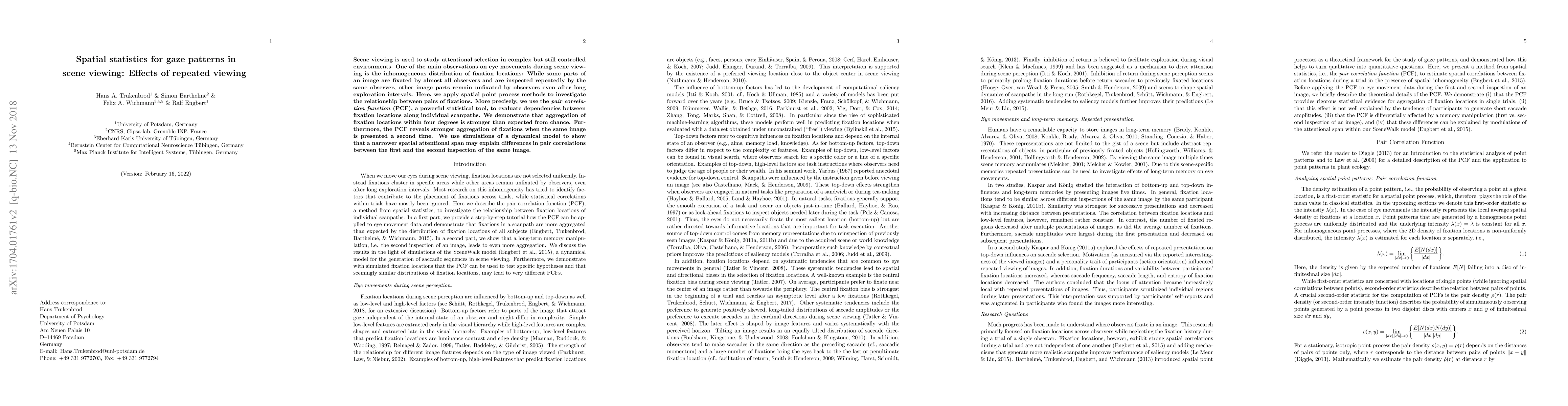 This paper uses spatial point process methods, specifically the pair correlation function (PCF), to analyze gaze patterns during scene viewing, revealing stronger aggregation of fixations within four degrees when images are viewed repeatedly. The study suggests that a narrower spatial attentional span may account for differences in fixation patterns between first and second viewings.