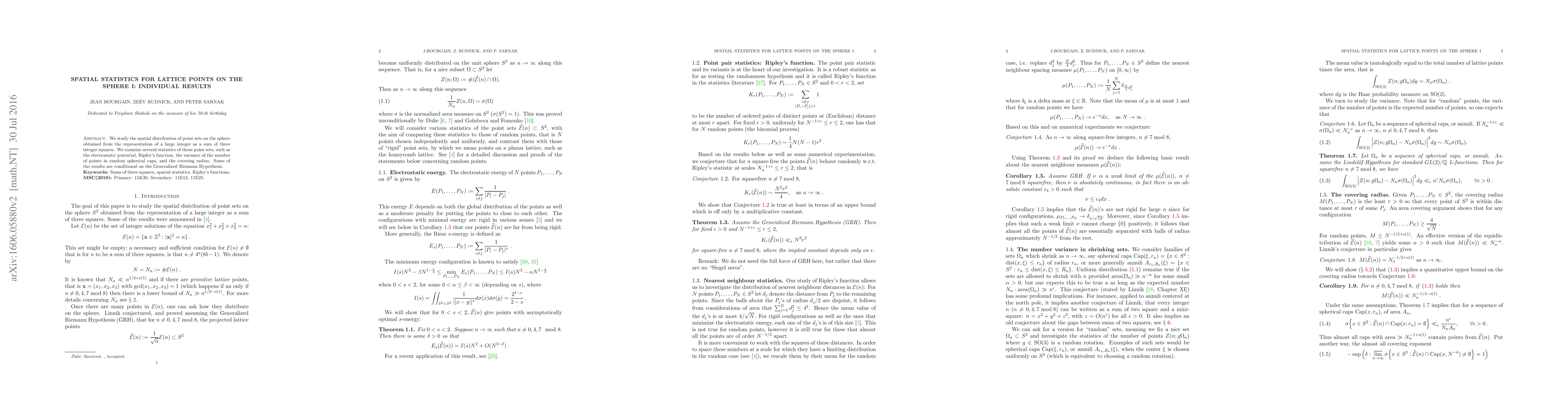 We study the spatial distribution of point sets on the sphere obtained from the representation of a large integer as a sum of three integer squares. We examine several statistics of these point sets, such as the electrostatic potential, Ripley's function, the variance of the number of points in random spherical caps, and the covering radius. Some of the results are conditional on the Generalized Riemann Hypothesis.