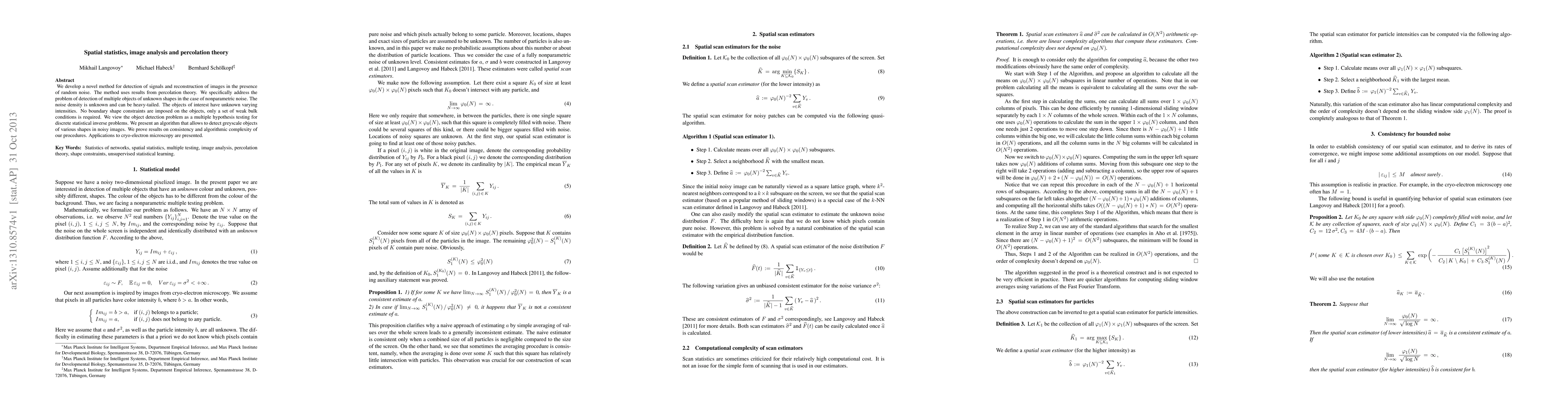 This research introduces a new method using percolation theory for detecting and reconstructing multiple, unknown-shaped objects in noisy images. It presents an algorithm for greyscale object detection, proves consistency and complexity results, and demonstrates applications in cryo-electron microscopy.