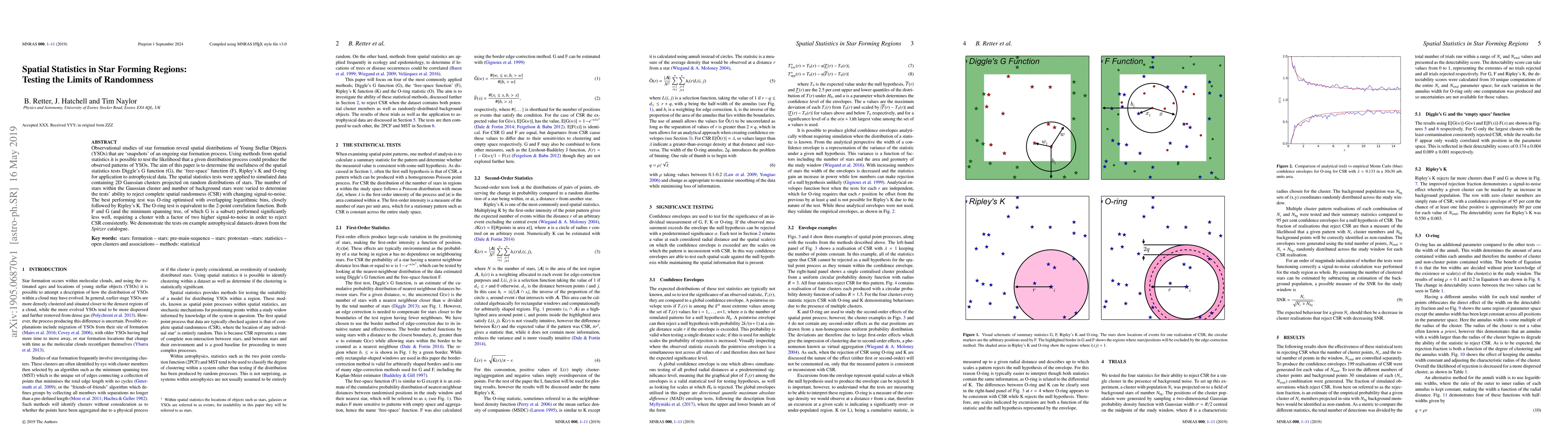 Observational studies of star formation reveal spatial distributions of Young Stellar Objects (YSOs) that are `snapshots' of an ongoing star formation process. Using methods from spatial statistics it is possible to test the likelihood that a given distribution process could produce the observed patterns of YSOs. The aim of this paper is to determine the usefulness of the spatial statistics tests Diggle's G function (G), the `free-space' function (F), Ripley's K and O-ring for application to astrophysical data. The spatial statistics tests were applied to simulated data containing 2D Gaussian clusters projected on random distributions of stars. The number of stars within the Gaussian cluster and number of background stars were varied to determine the tests' ability to reject complete spatial randomness (CSR) with changing signal-to-noise. The best performing test was O-ring optimised with overlapping logarithmic bins, closely followed by Ripley's K. The O-ring test is equivalent to the 2-point correlation function. Both F and G (and the minimum spanning tree, of which G is a subset) performed significantly less well, requiring a cluster with a factor of two higher signal-to-noise in order to reject CSR consistently. We demonstrate the tests on example astrophysical datasets drawn from the Spitzer catalogue.