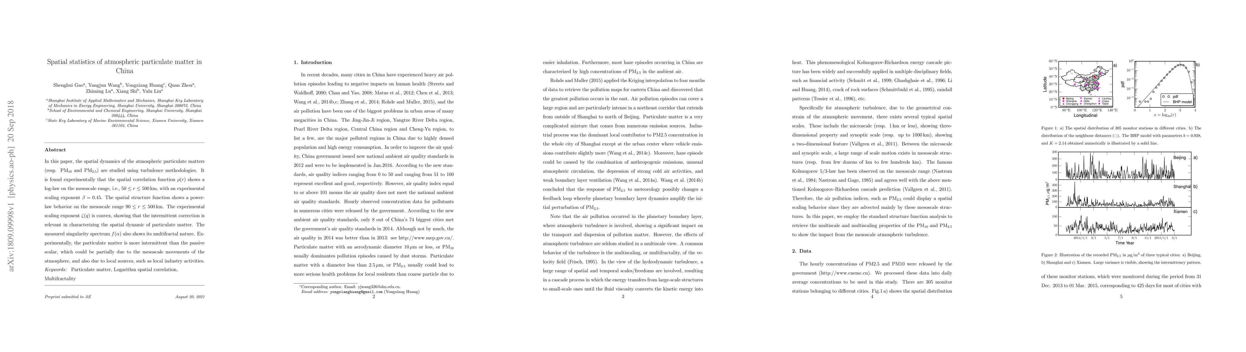 This paper investigates the spatial dynamics of atmospheric particulate matter (PM$_{10}$ and PM$_{2.5}$) in China using turbulence methodologies, revealing a log-law spatial correlation function and a power-law spatial structure function on mesoscale ranges. The findings suggest a multifractal nature of particulate matter, indicating higher intermittency than passive scalars, influenced by both atmospheric mesoscale movements and local sources like industrial activities.